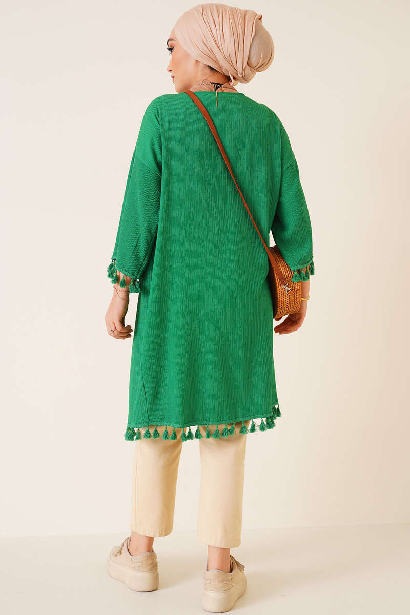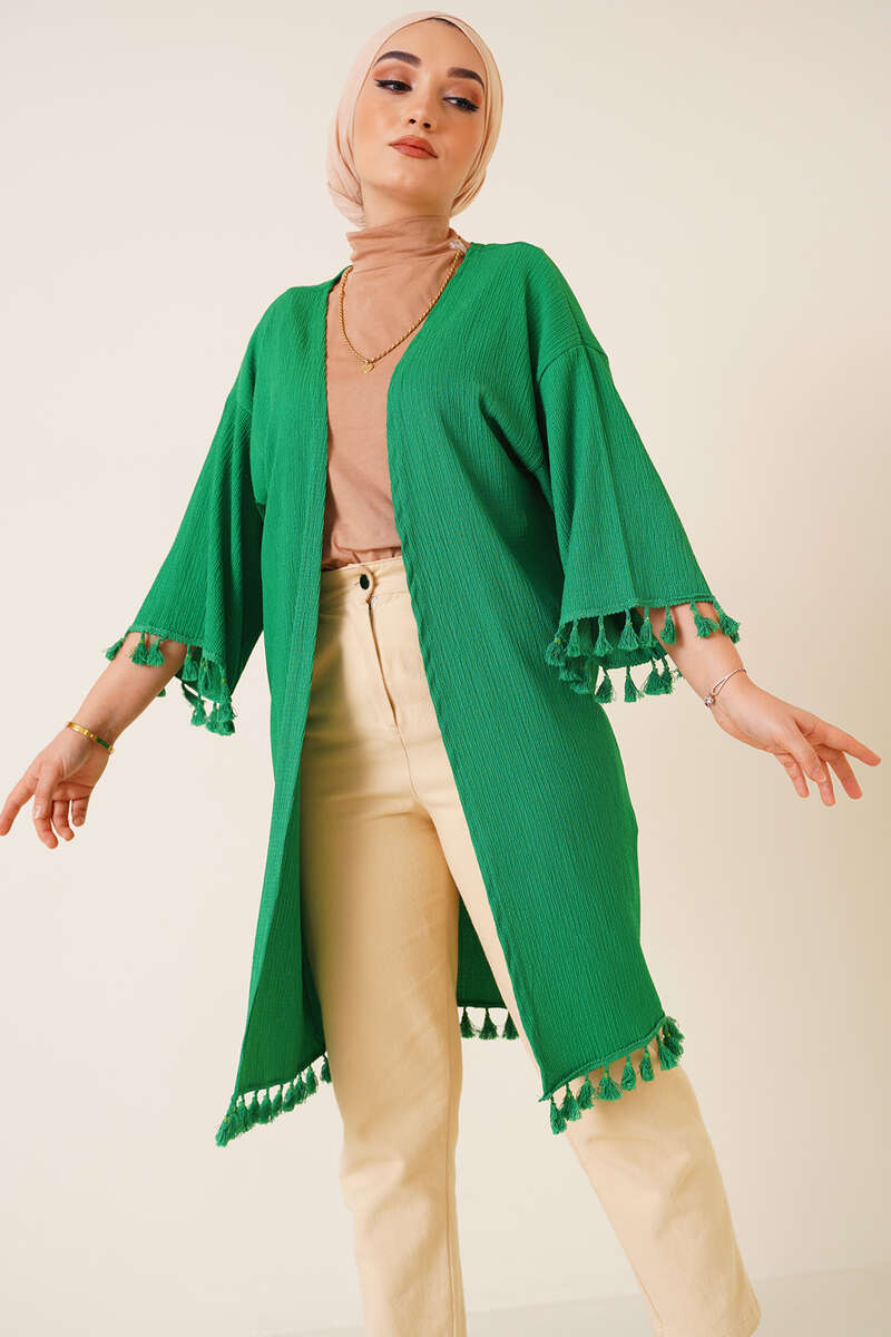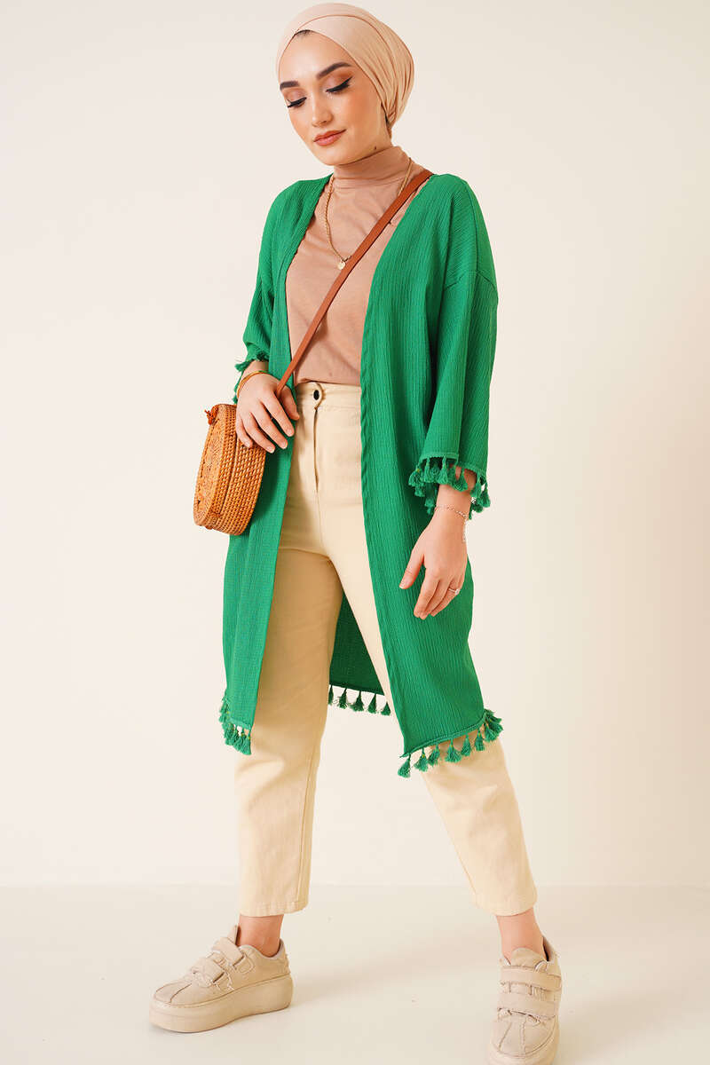 Yeni sezon model hırkamız üzerinizden çıkarmak istemeyeceğiniz şıklıkta. Salaş bir görünüm sunan hırkamız düşük omuzludur. Etek uçları ve kol uçları püskül süslemelidir.