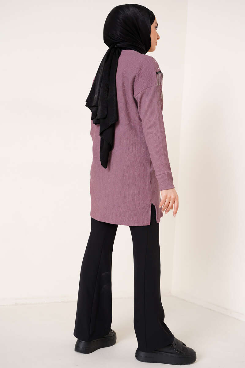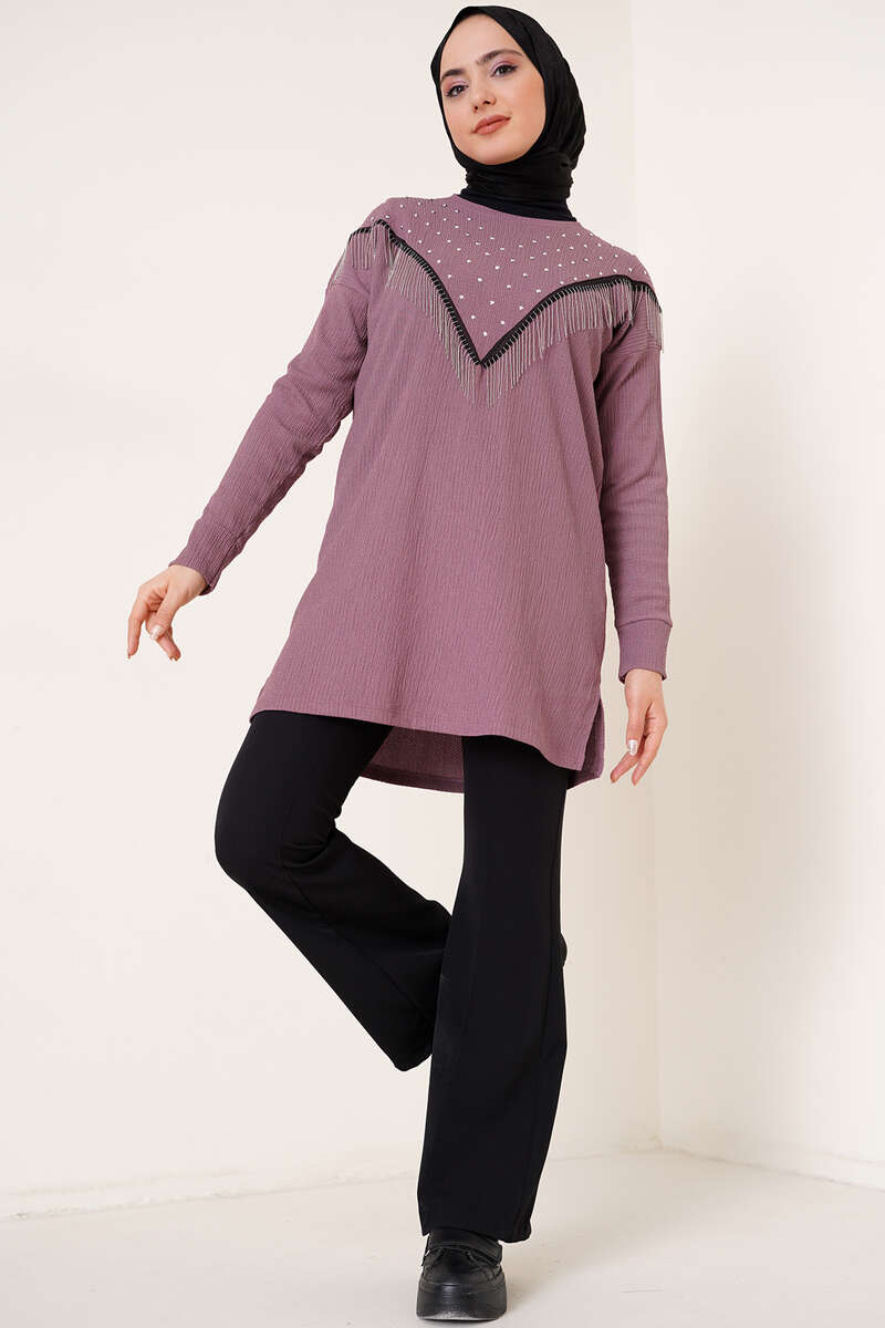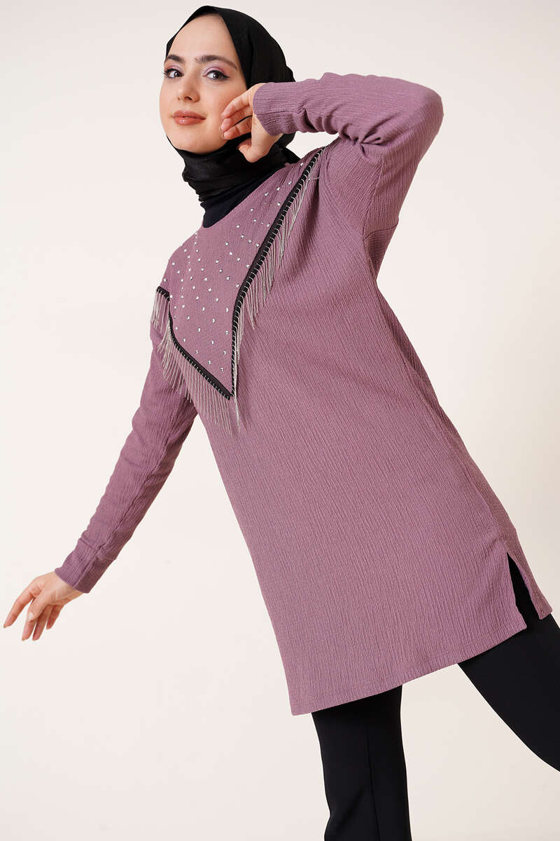 Yeni sezon bürümcük tunik önü püskül zincir süslemelidir. Düşük omuz model olan tuniğimizin önü parlak taşlarla süslenmiştir. Tuniğimiz bisiklet yakadır. Her iki yanında yırtmacı bulunmaktadır.
