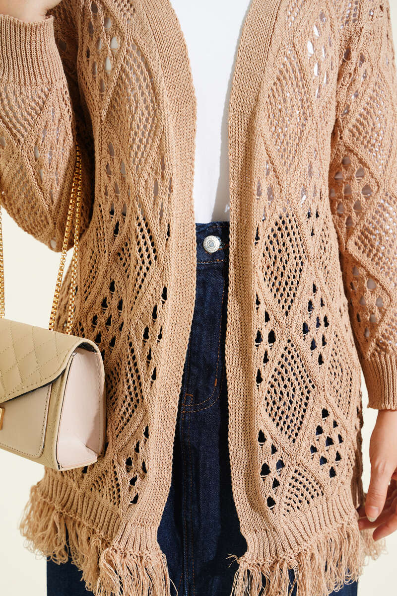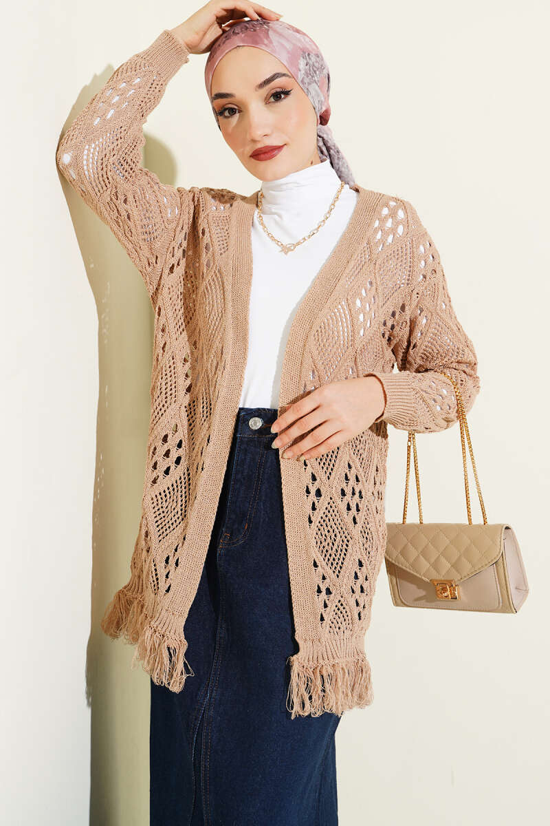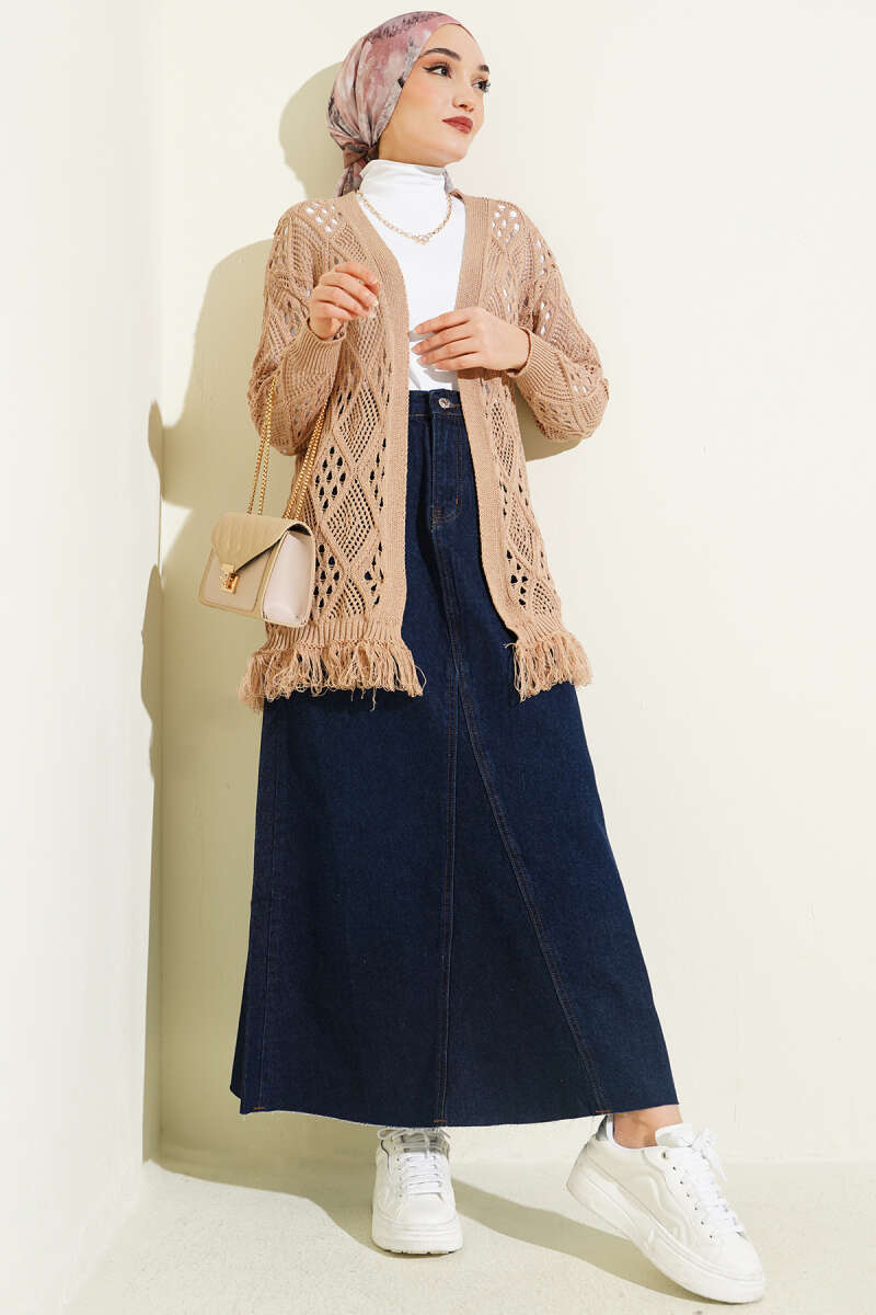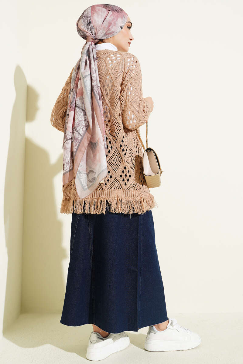 Etek ucundaki püskül detayları, tasarıma hareketli ve bohem bir hava katarken, hafif yapısı sayesinde farklı mevsimlerde rahatlıkla kullanılabilir. Dökümlü formu ve şık manşetleri ile pantolon veya elbiselerin üzerine mükemmel bir tamamlayıcı olan bu parça, günlük şıklığınıza sofistike bir dokunuş ekler.