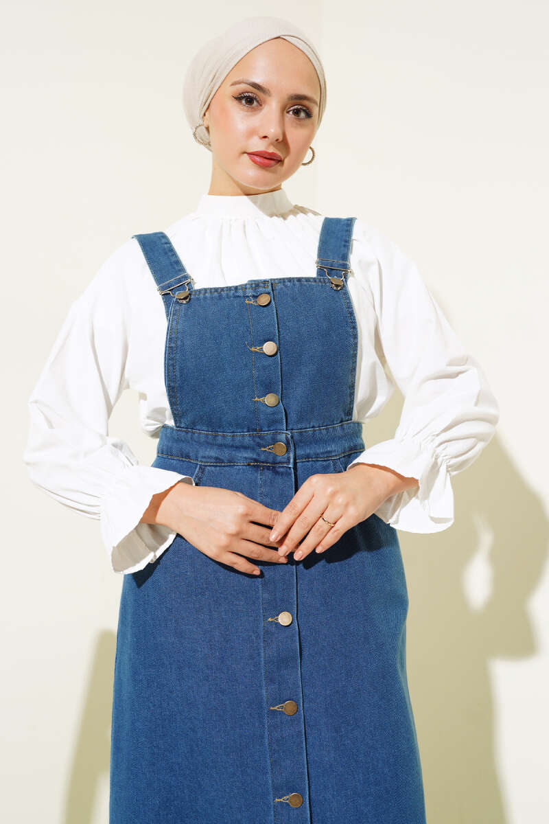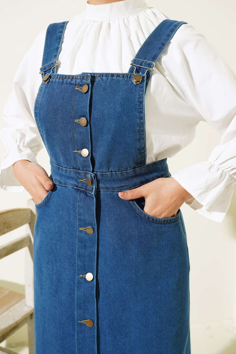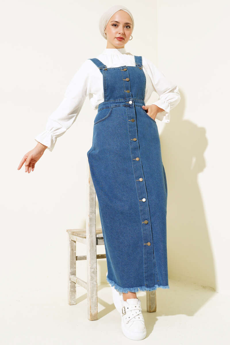 Püsküllü Boydan Düğmeli Kot Slopet Mavi