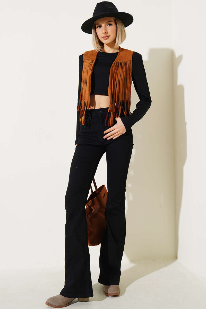 Püsküllü Kısa Süet Yelek Taba