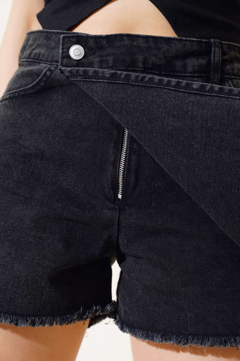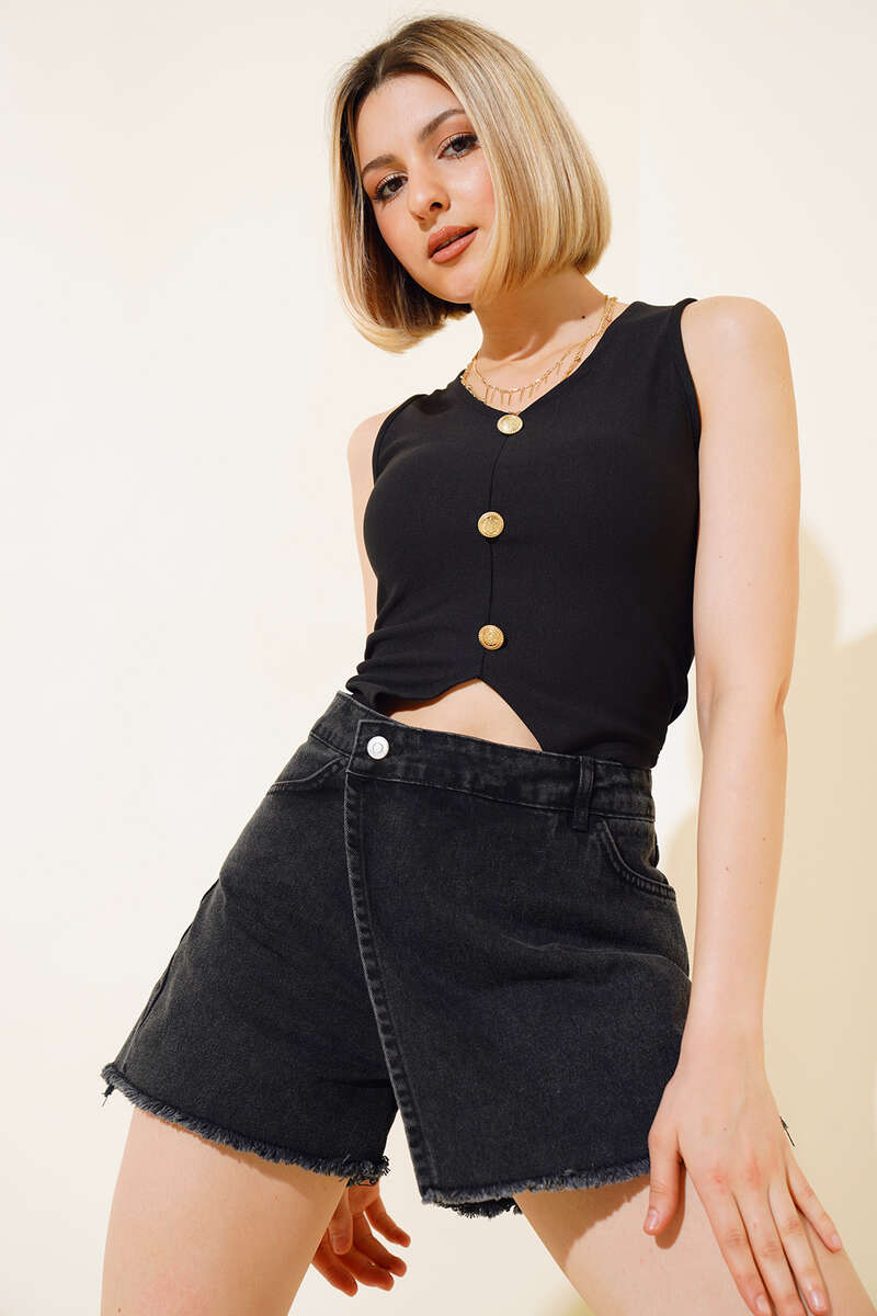 Yeni sezon şort eteğimiz sizlerle beraber. Şortumuzun beli düğmeli ve fermuarlıdır. İki önde iki arkada cebi vardır. Şortumuzun etek ucu püsküllüdür. Belinde dört adet kemer köprüsü vardır. Şortumuz kombinlerinizin aranan parçası olacaktır.