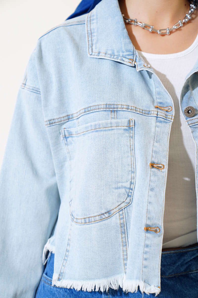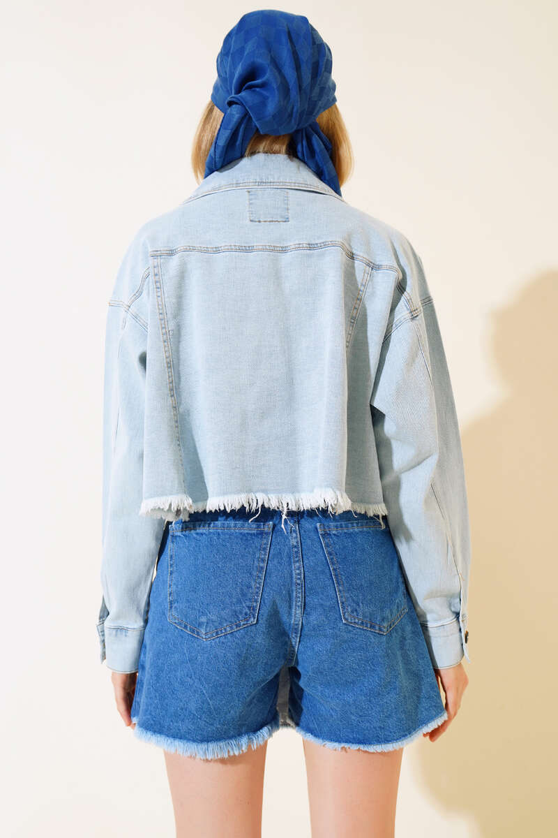 Püsküllü Salaş Kısa Kot Ceket Açık Mavi