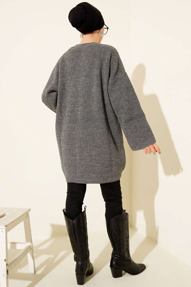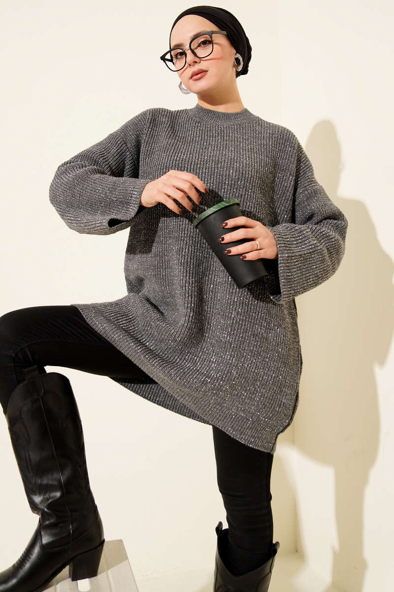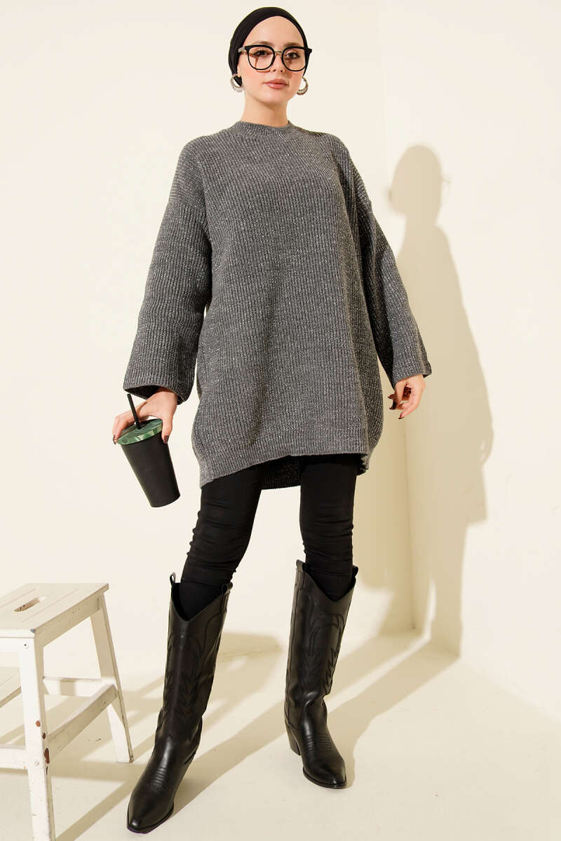 Salaş Bisiklet Yaka Simli Triko Tunik Gri