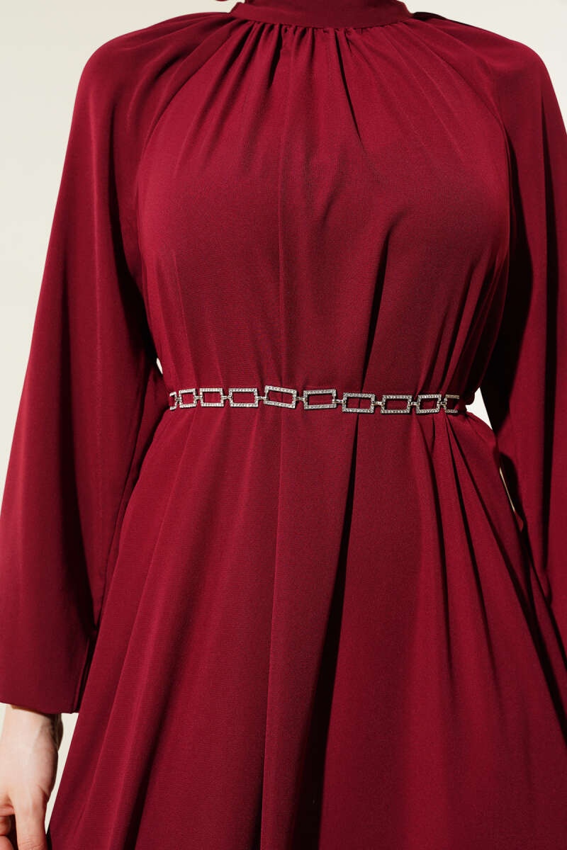 Bel Taşlı Pelerinli Abiye Elbise Bordo