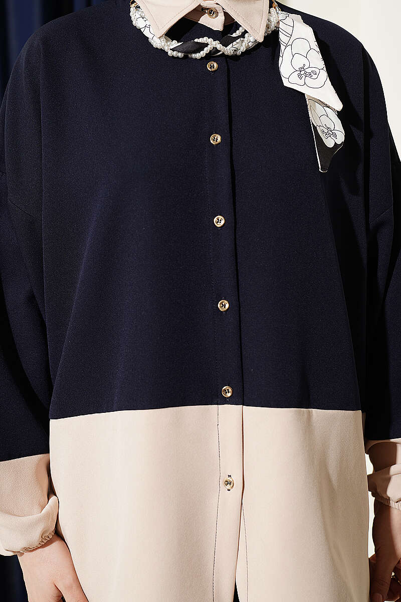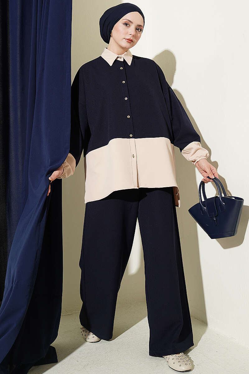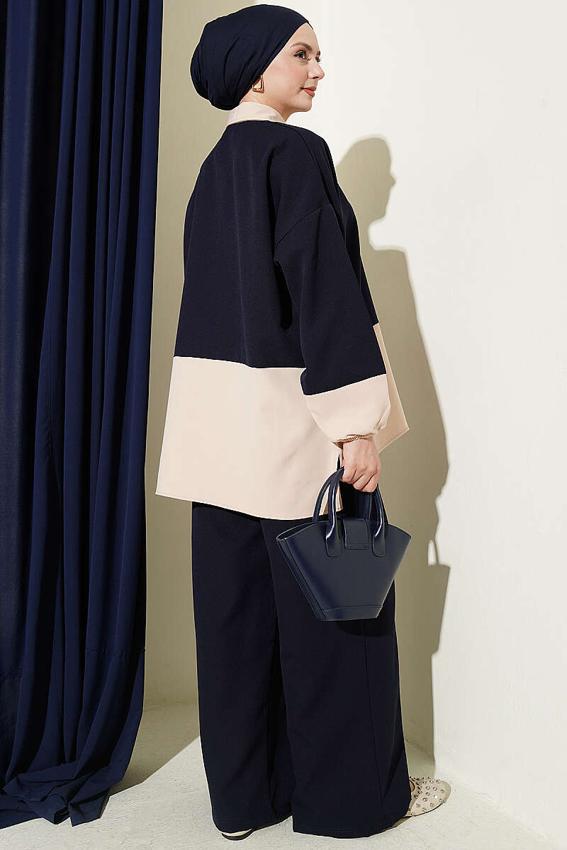 Renk Bloklu Fularlı İkili Takım Lacivert