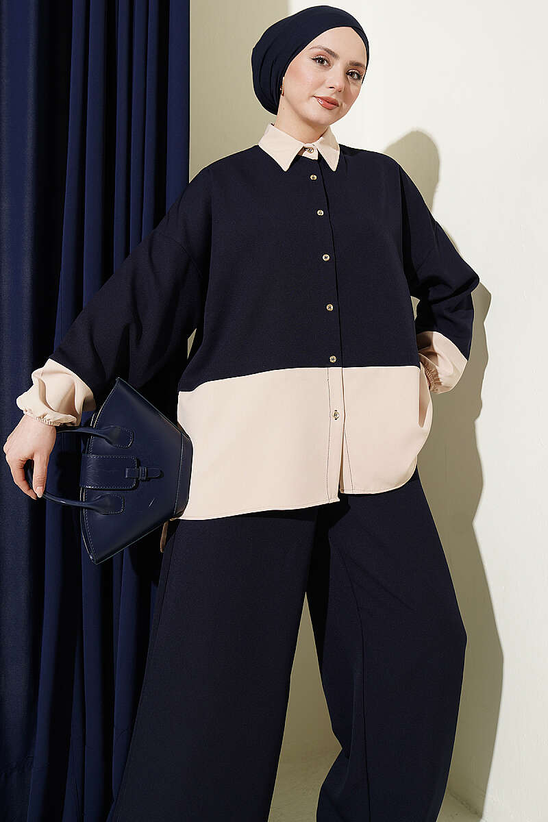 Modern bir tasarım anlayışını yansıtan bu renk bloklu ikili takım, gövde ve manşetlerdeki kontrast geçişleriyle görsel bir derinlik kazanır. Gömlek yaka detayı ve boydan düğmeli tasarımıyla klasik bir şıklık sunarken, dökümlü salaş kesimi sayesinde gün boyu konforlu bir kullanım vadeder. Takımı tamamlayan zarif fular detayı stilinize sofistike bir dokunuş katarken, geniş paça pantolonuyla hem günlük hem de yarı resmi ortamlar için çabasız bir zarafet oluşturur.