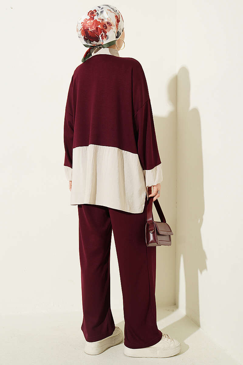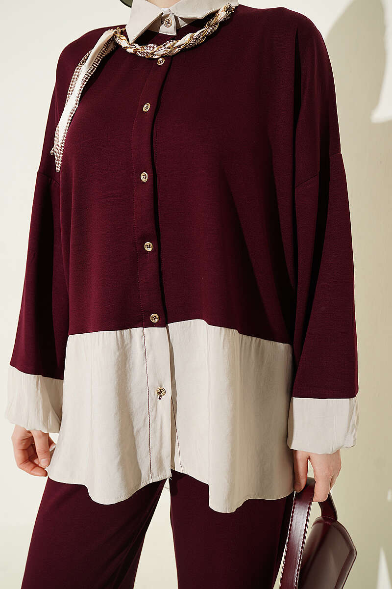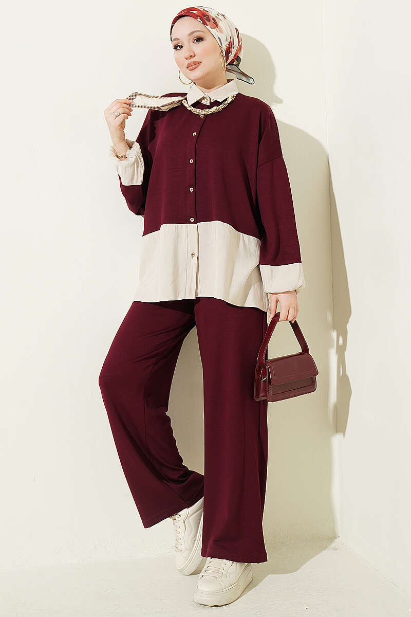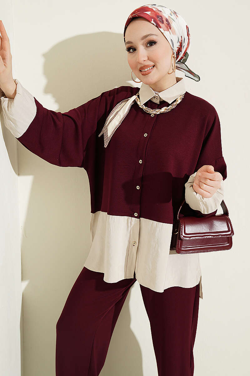 Renk Bloklu Fularlı İkili Takım Mürdüm
