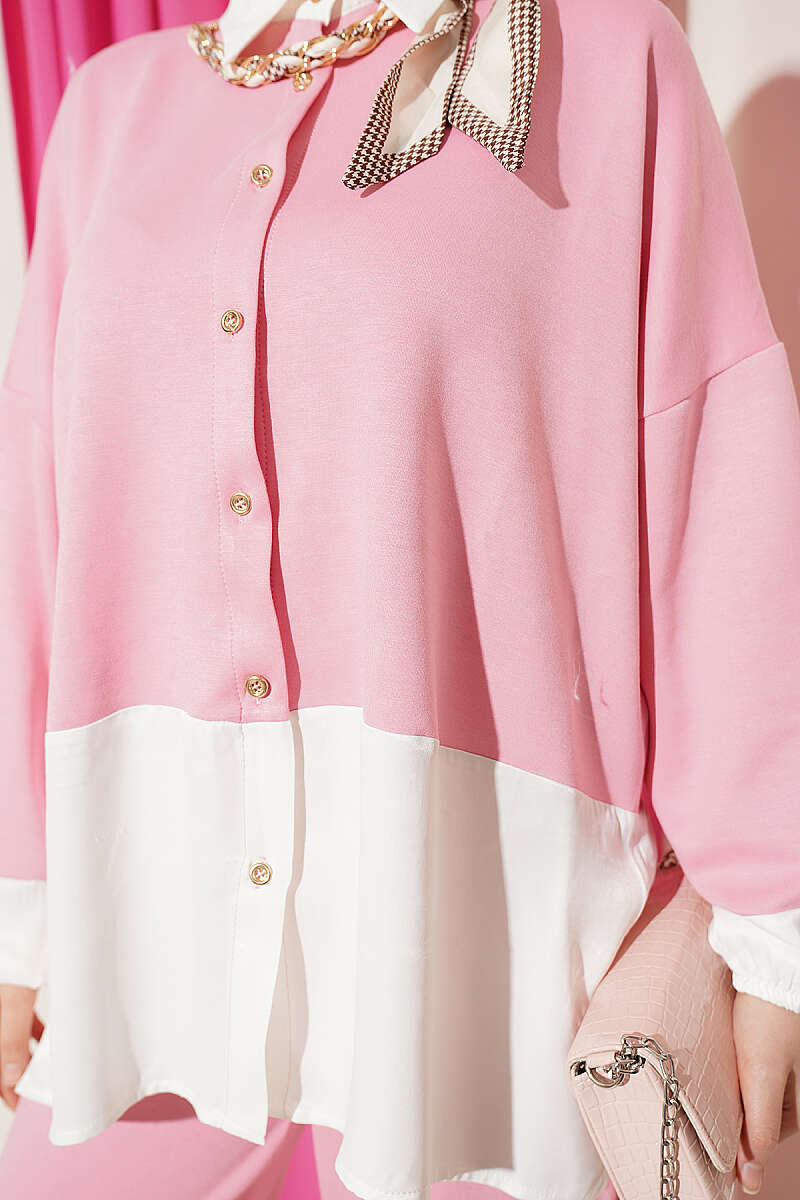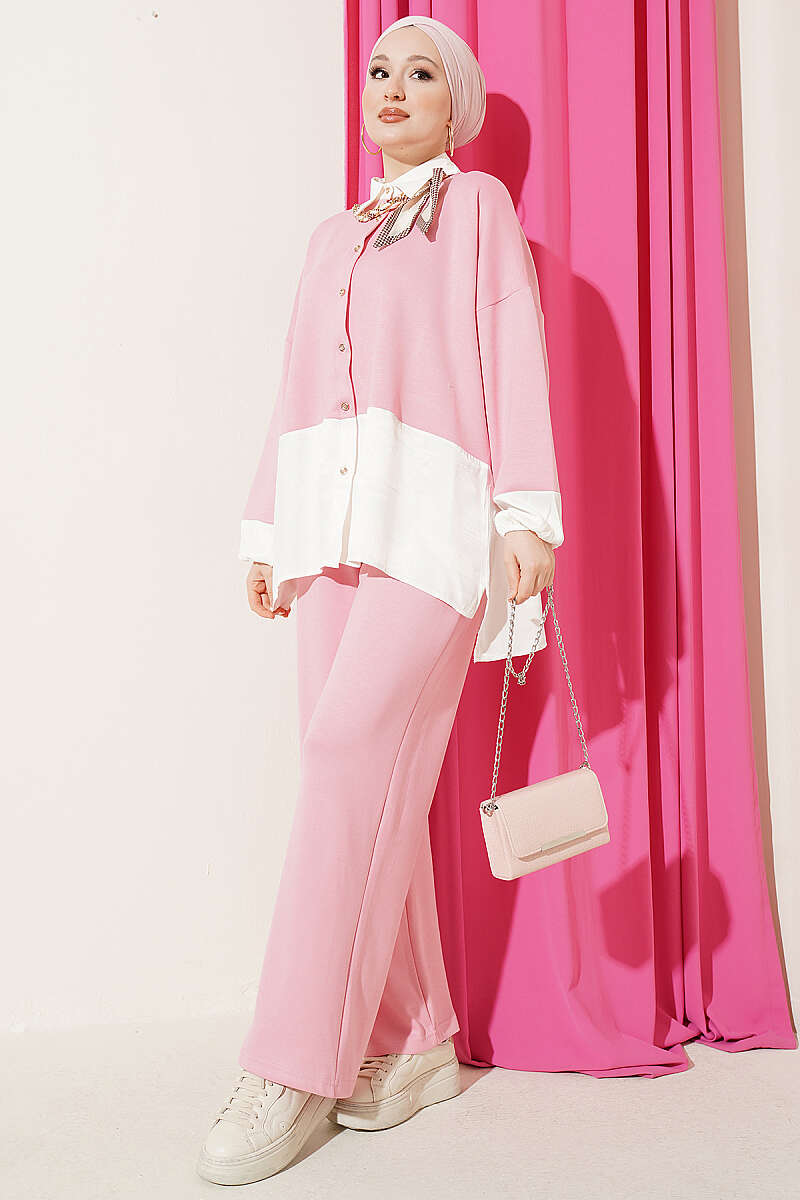 Modern bir tasarım anlayışını yansıtan bu renk bloklu ikili takım, gövde ve manşetlerdeki kontrast geçişleriyle görsel bir derinlik kazanır. Gömlek yaka detayı ve boydan düğmeli tasarımıyla klasik bir şıklık sunarken, dökümlü salaş kesimi sayesinde gün boyu konforlu bir kullanım vadeder. Takımı tamamlayan zarif fular detayı stilinize sofistike bir dokunuş katarken, geniş paça pantolonuyla hem günlük hem de yarı resmi ortamlar için çabasız bir zarafet oluşturur.