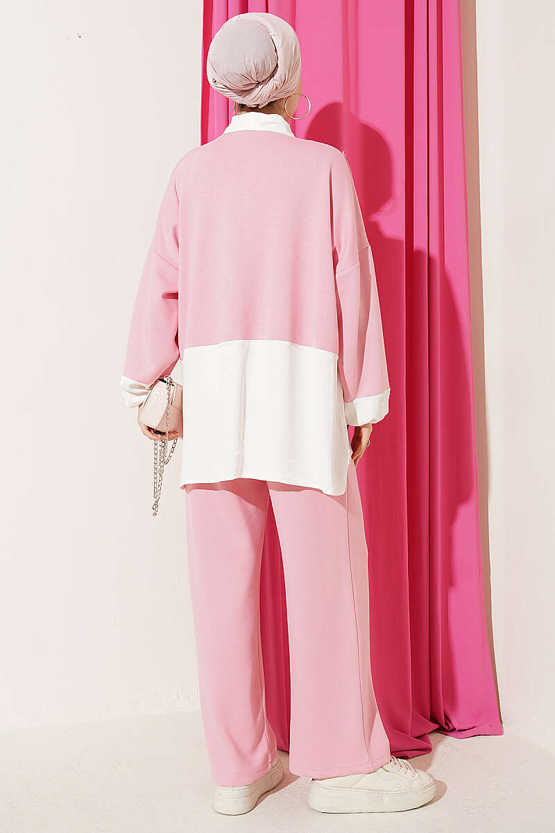 Renk Bloklu Fularlı İkili Takım Pudra