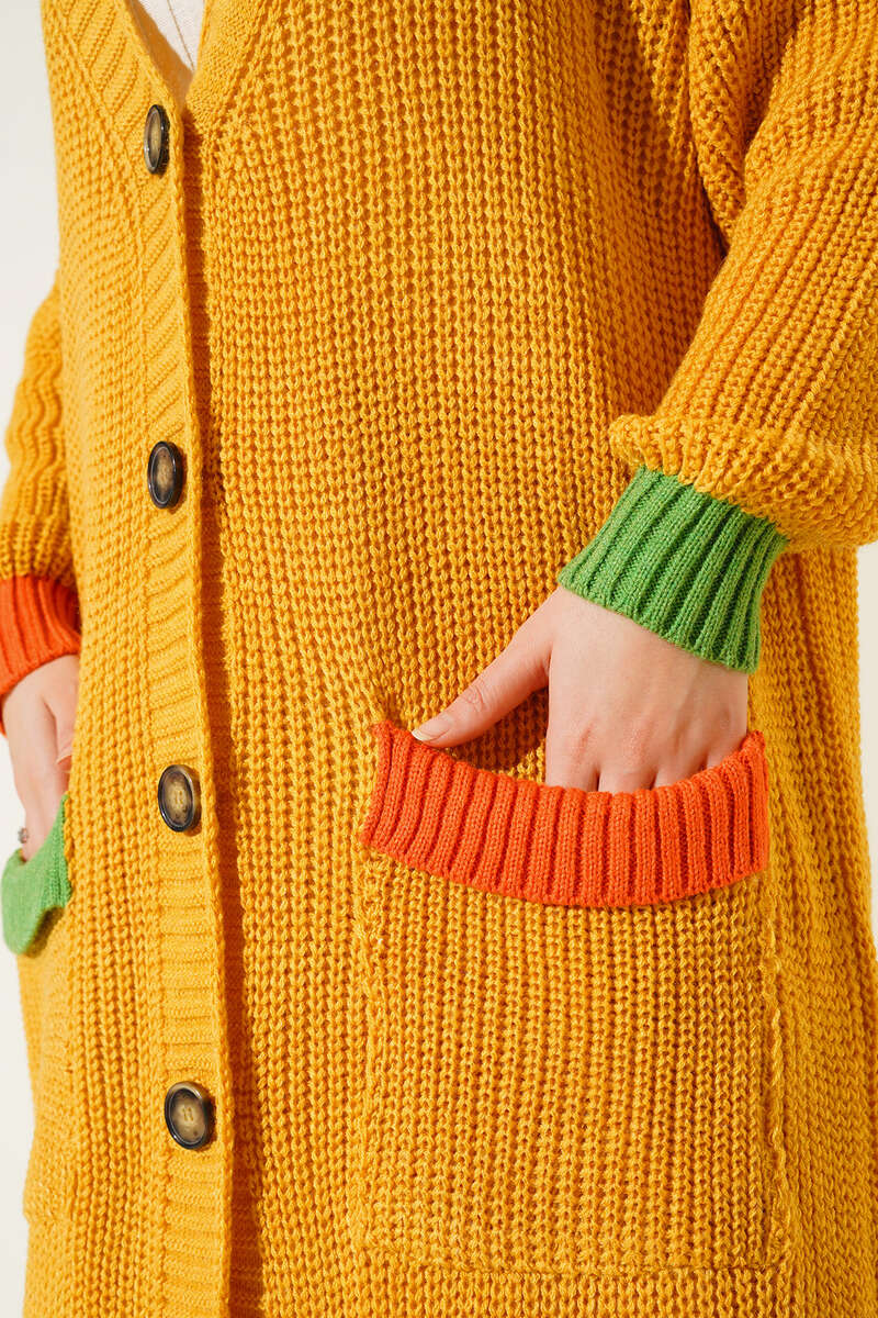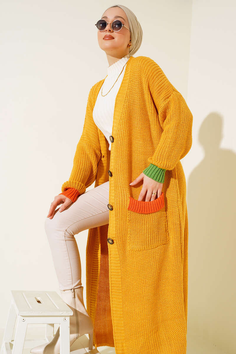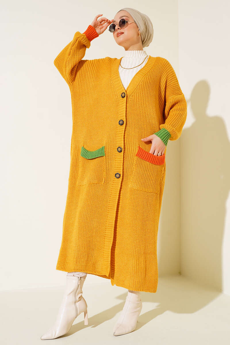Yeni sezon hırka lacivert renklidir. Triko hırka düğmeli modeldir. Salaş kesime sahip, düşük omuzludur. Kolları esnek ribanalıdı, çift ceplidir. Geniş renk alternatifi mevcuttur.