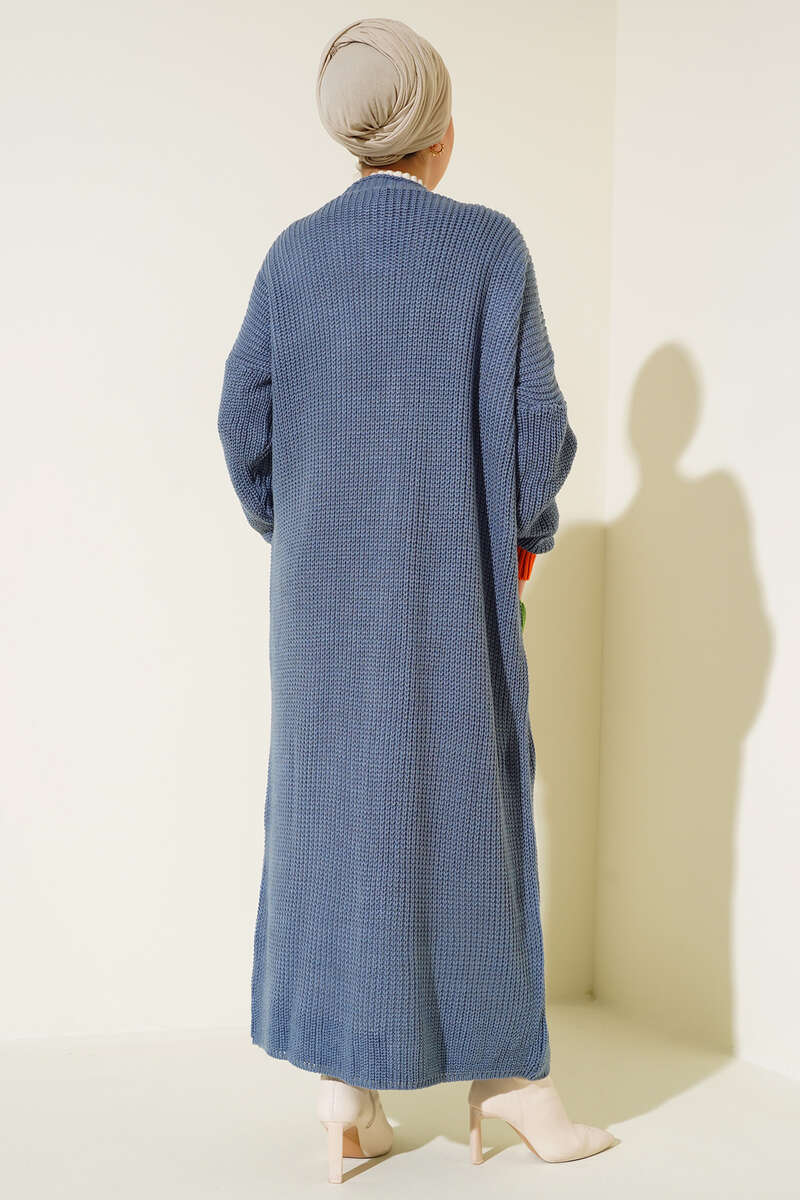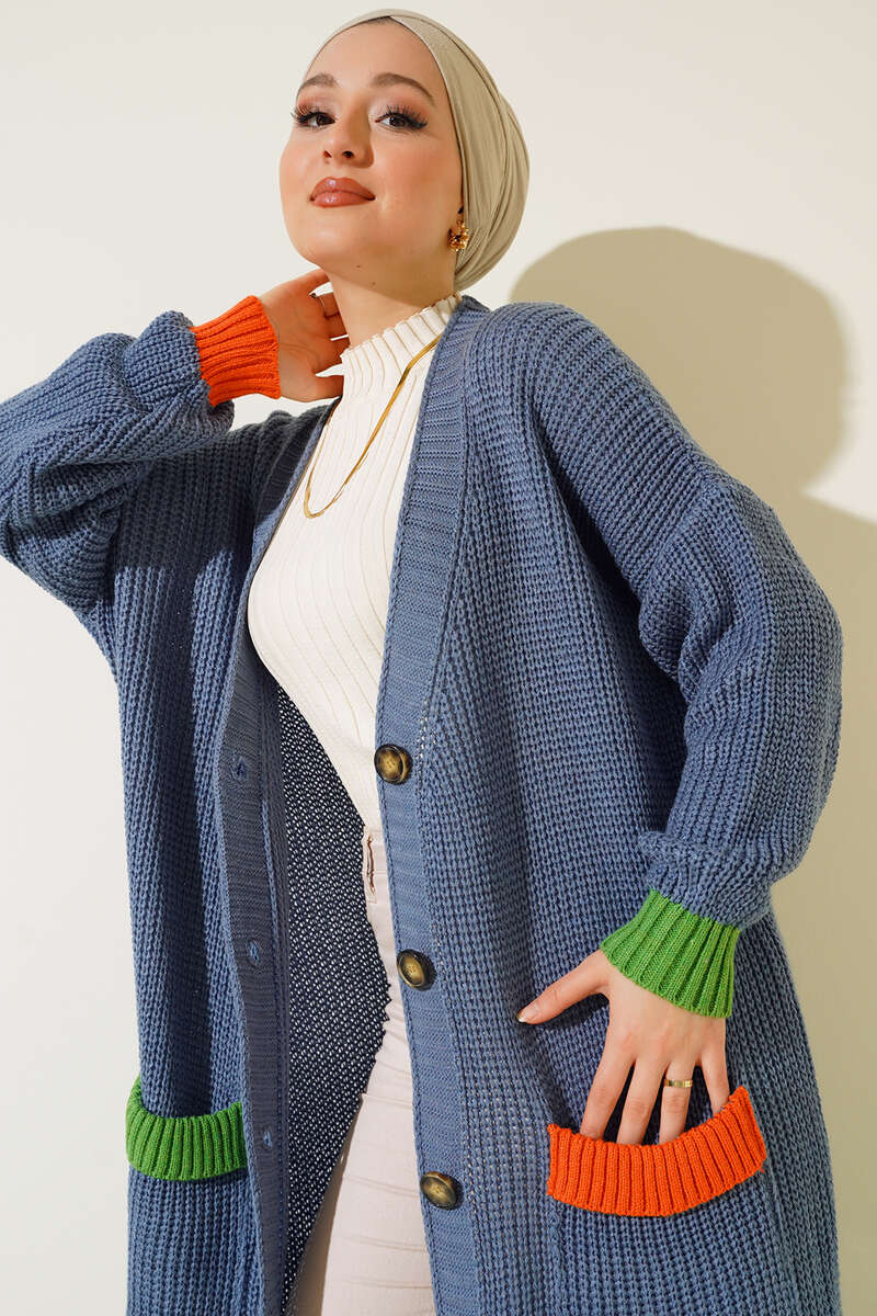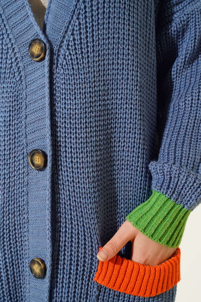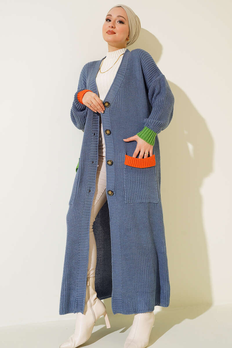 Yeni sezon hırka lacivert renklidir. Triko hırka düğmeli modeldir. Salaş kesime sahip, düşük omuzludur. Kolları esnek ribanalıdı, çift ceplidir. Geniş renk alternatifi mevcuttur.