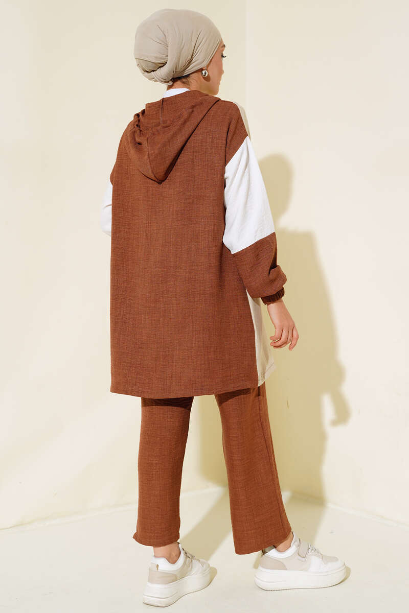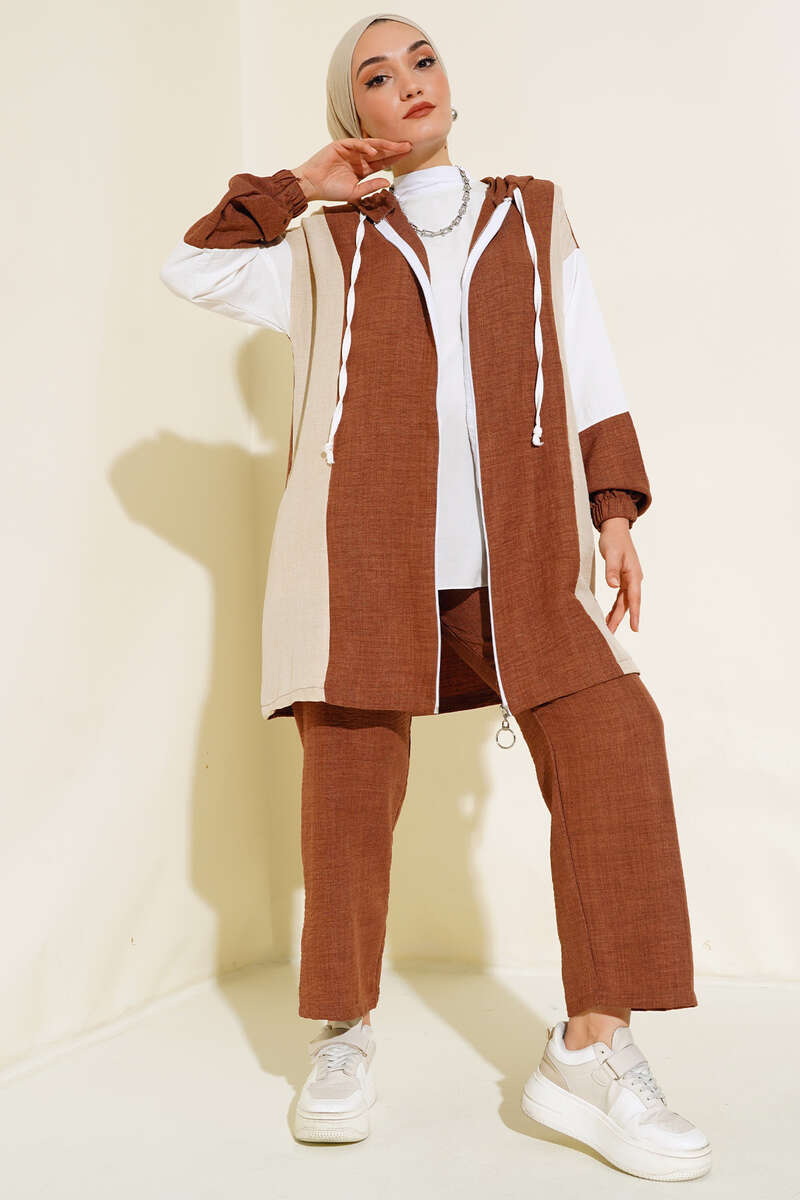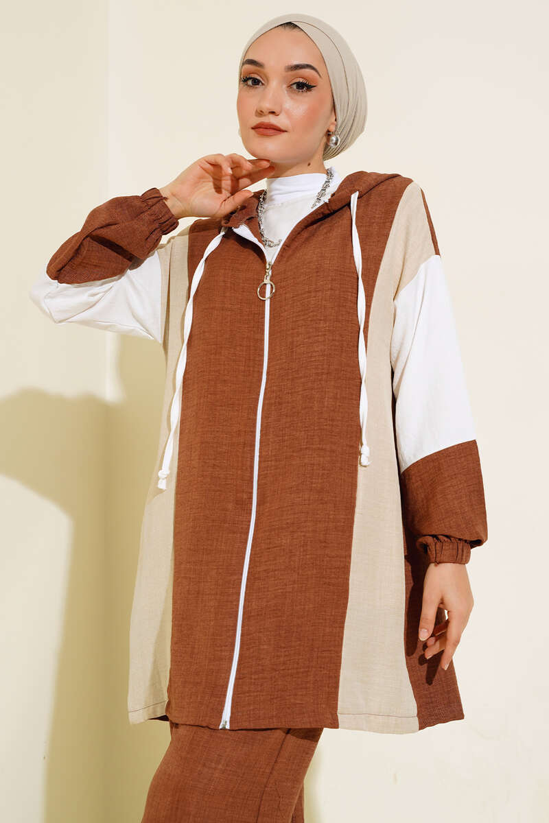 Renk Geçişli Fermuarlı Keten İkili Takım Kahve
