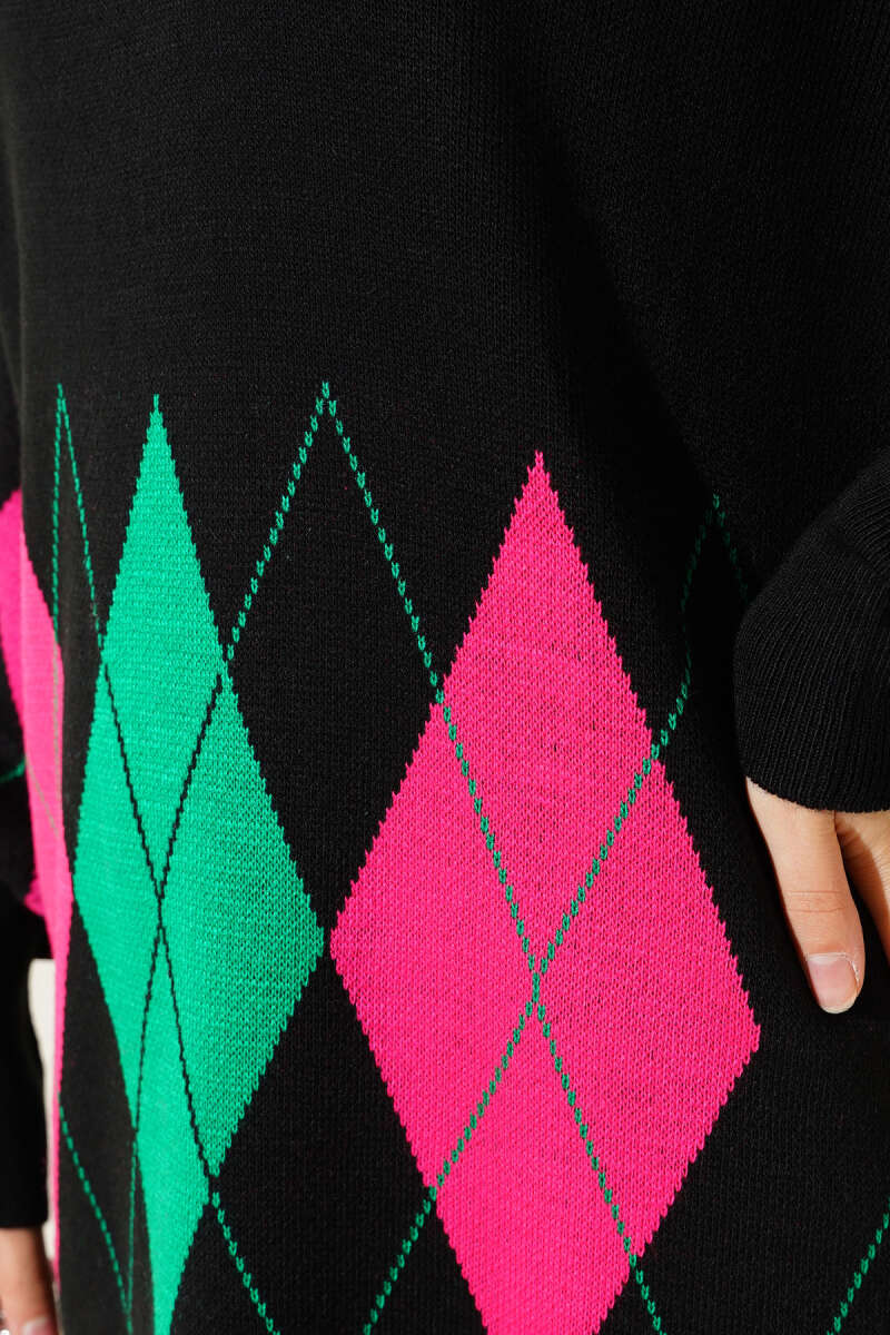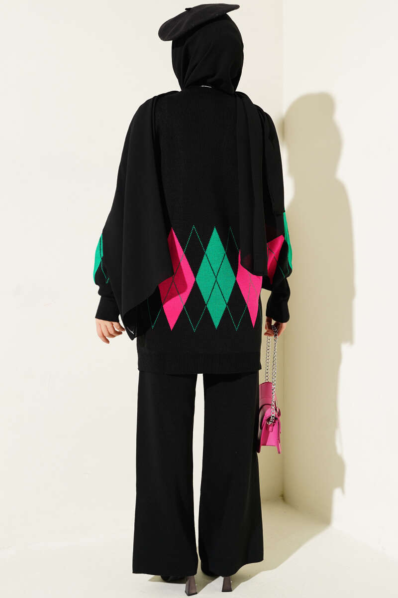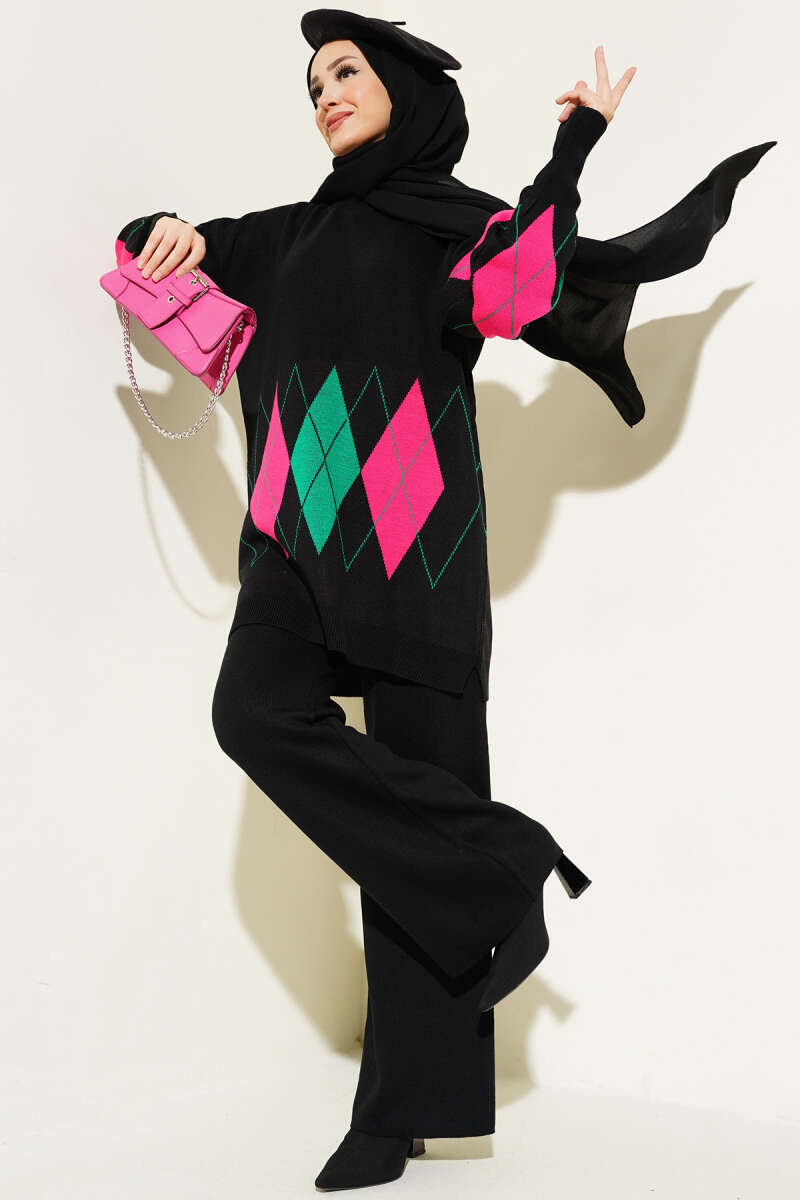 Renkli Baklava Desen Triko İkili Takım Siyah
