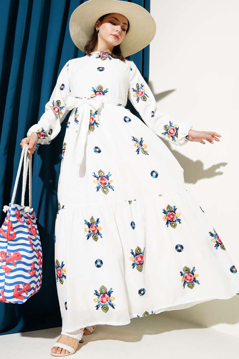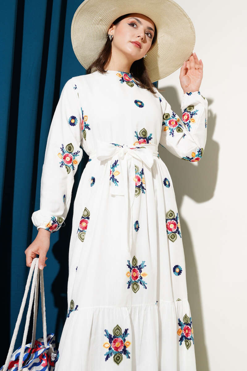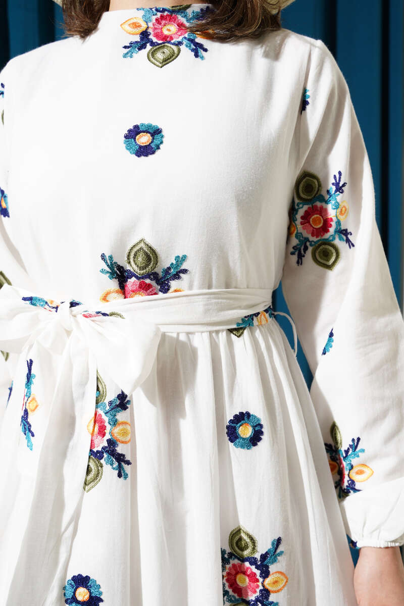 Renkli Çiçek Nakışlı Kuşaklı Elbise Beyaz