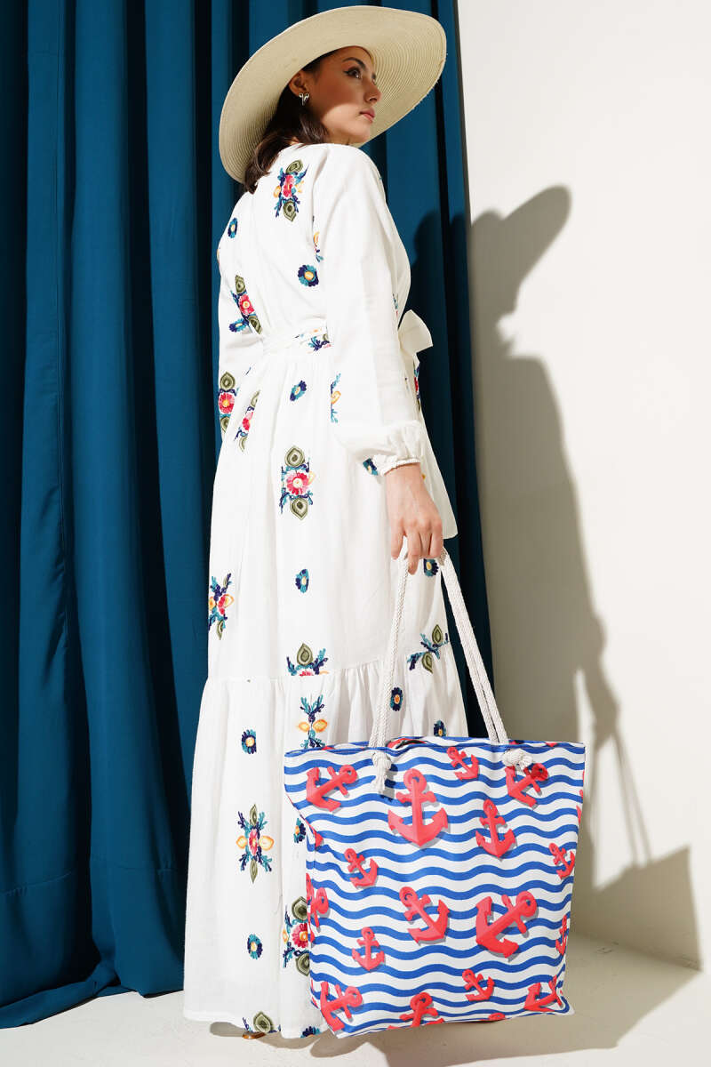 Bel Lastikli Brodeli Elbise Mavi