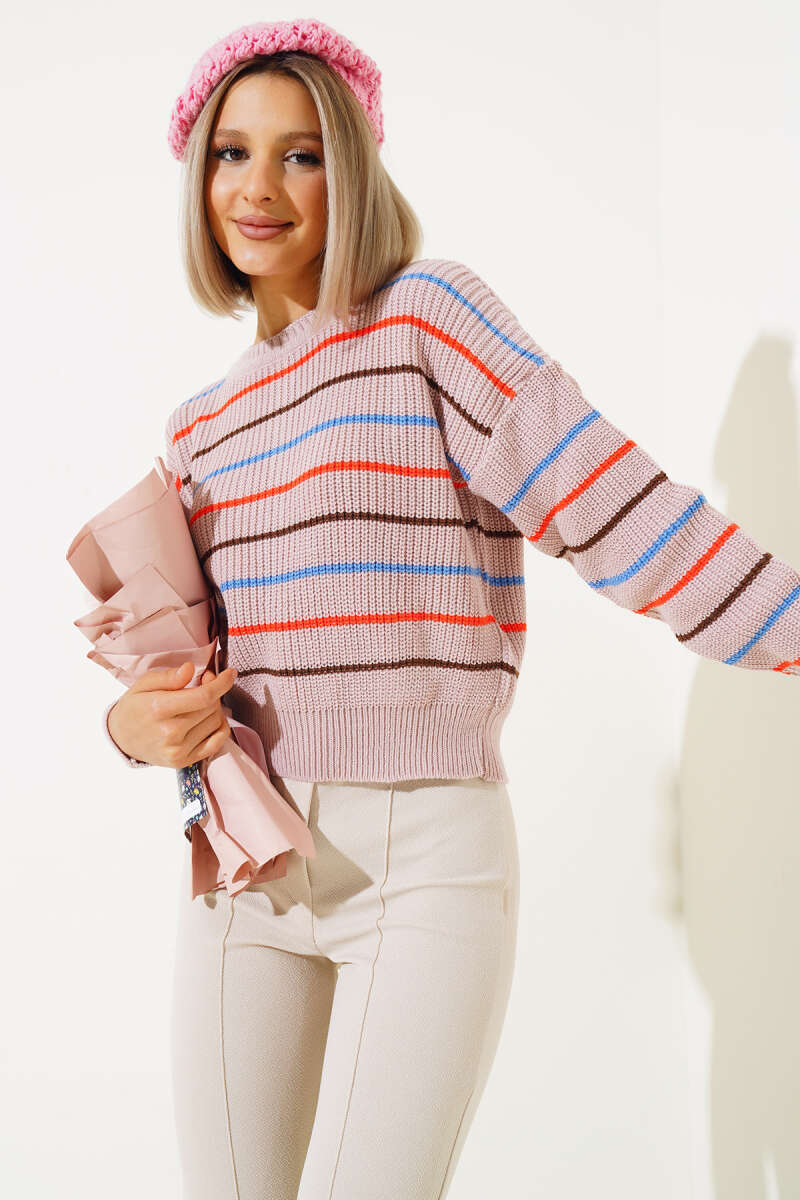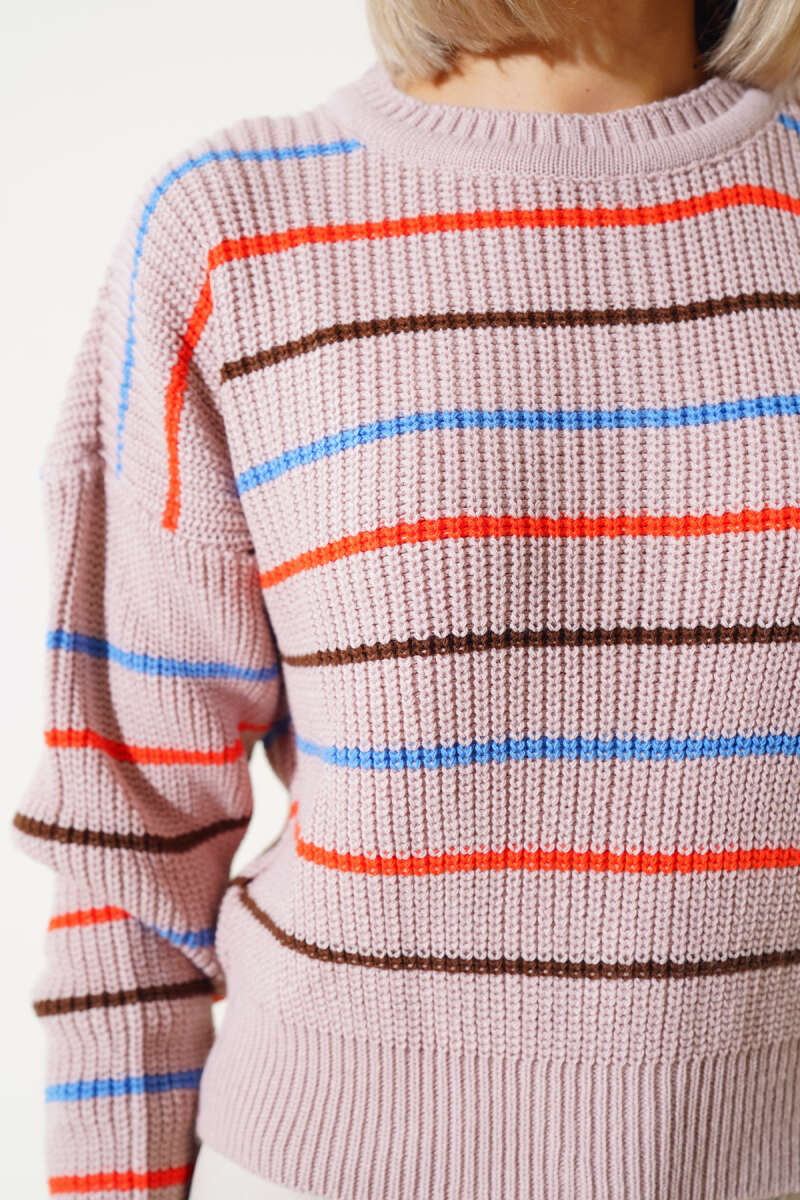 V Yaka Fitilli Çizgili Triko Tunik Kahve