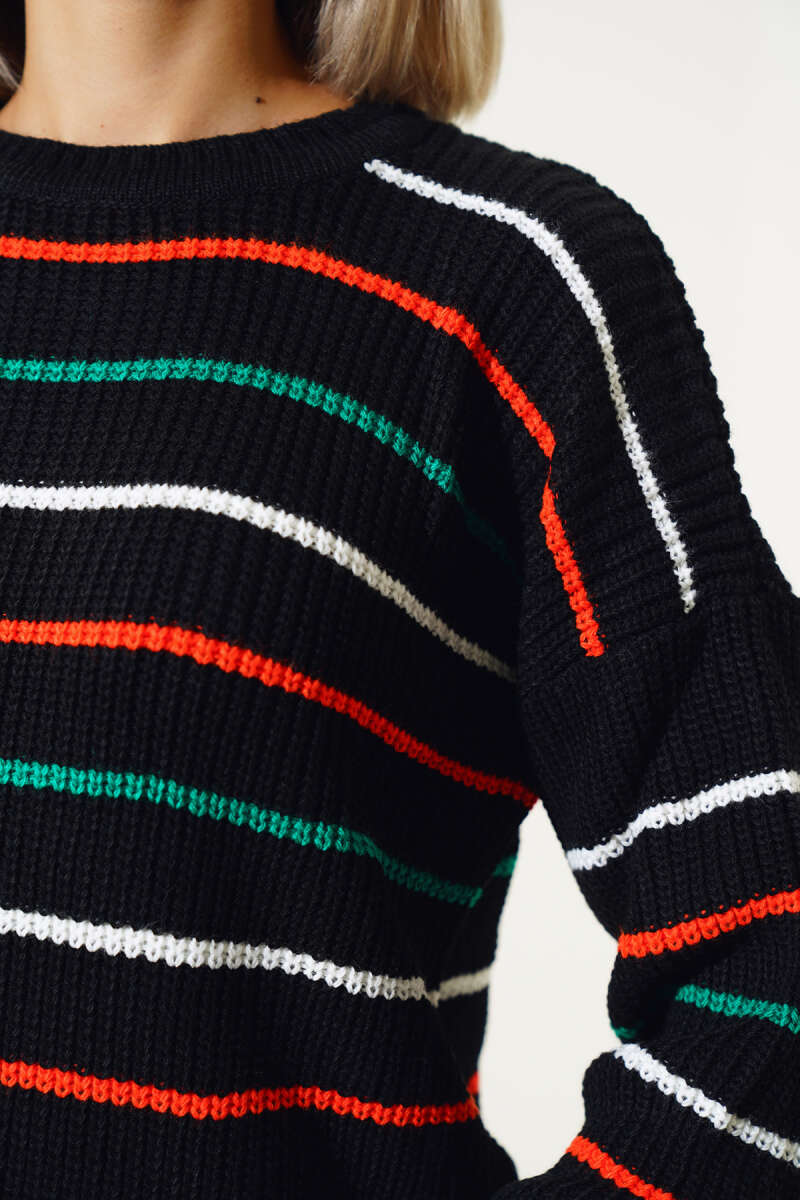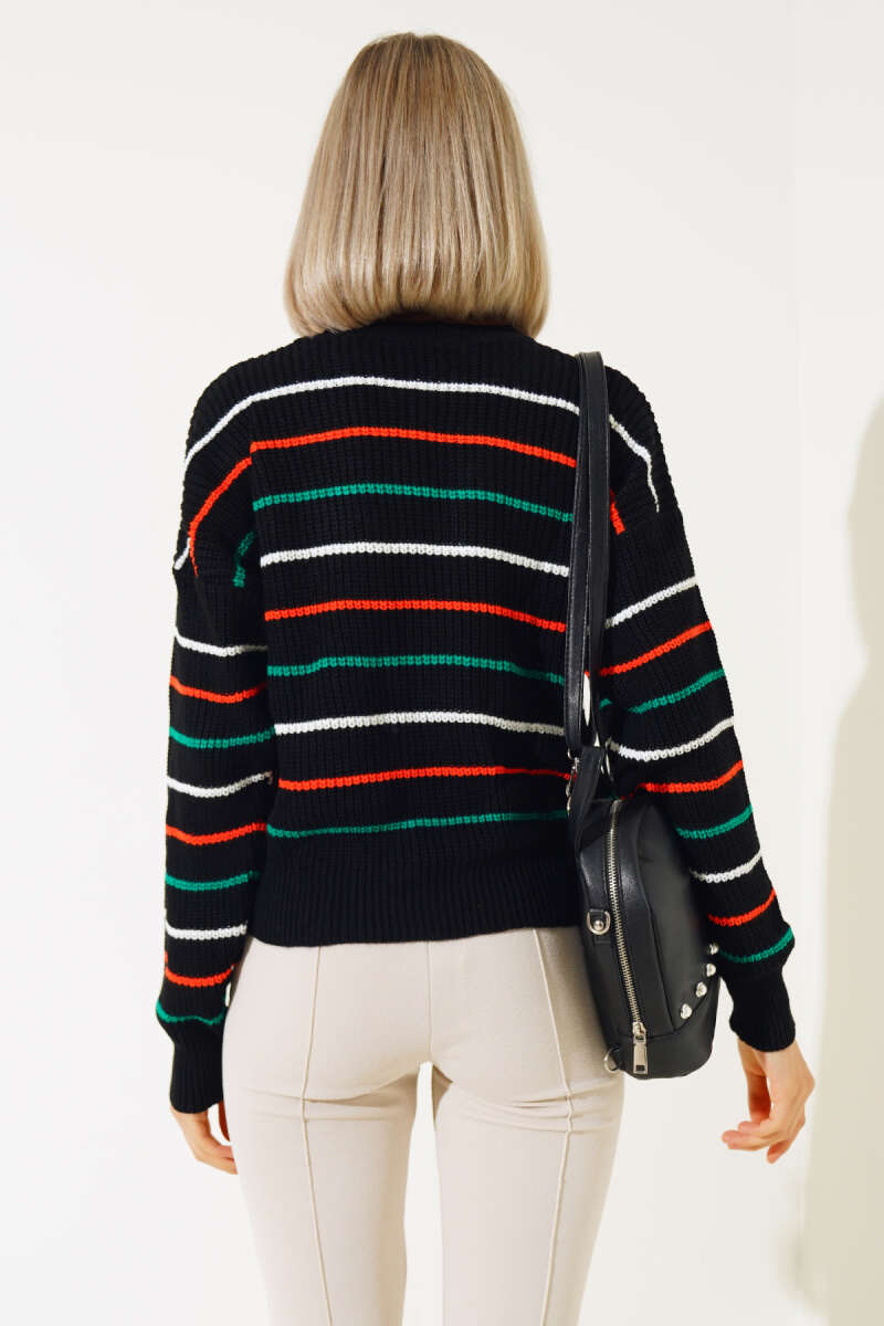 V Yaka Fitilli Çizgili Triko Tunik Kahve