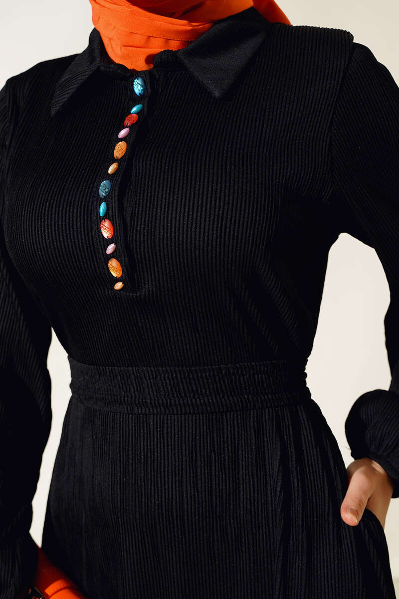 Boydan Düğmeli Tencel Kot Elbise Füme