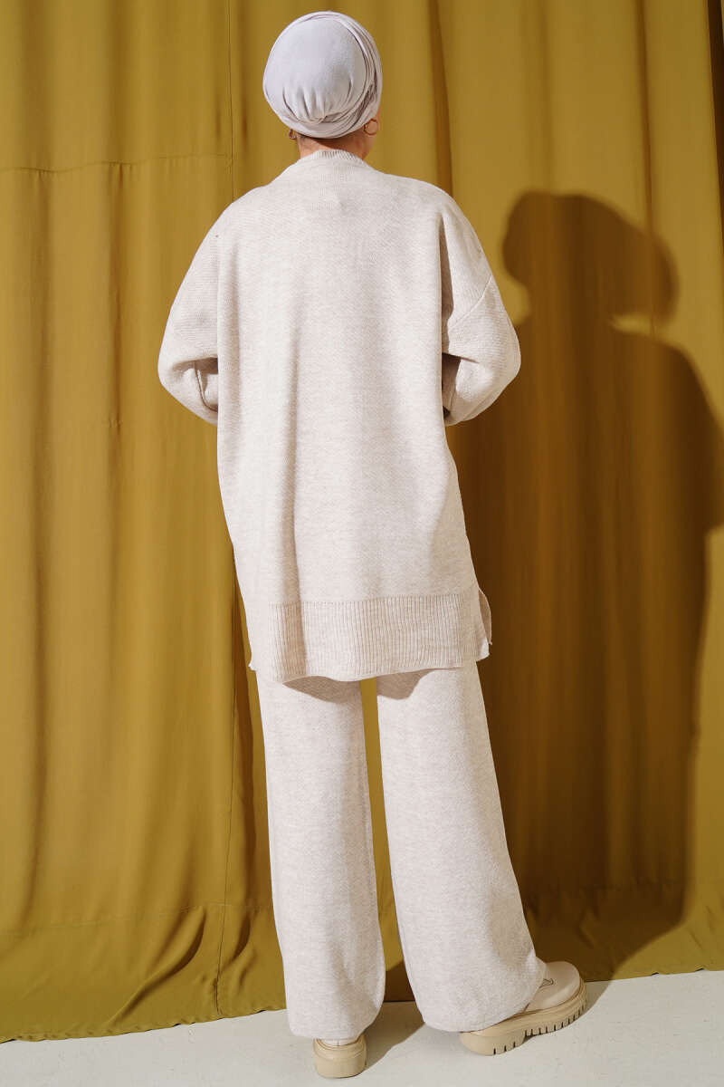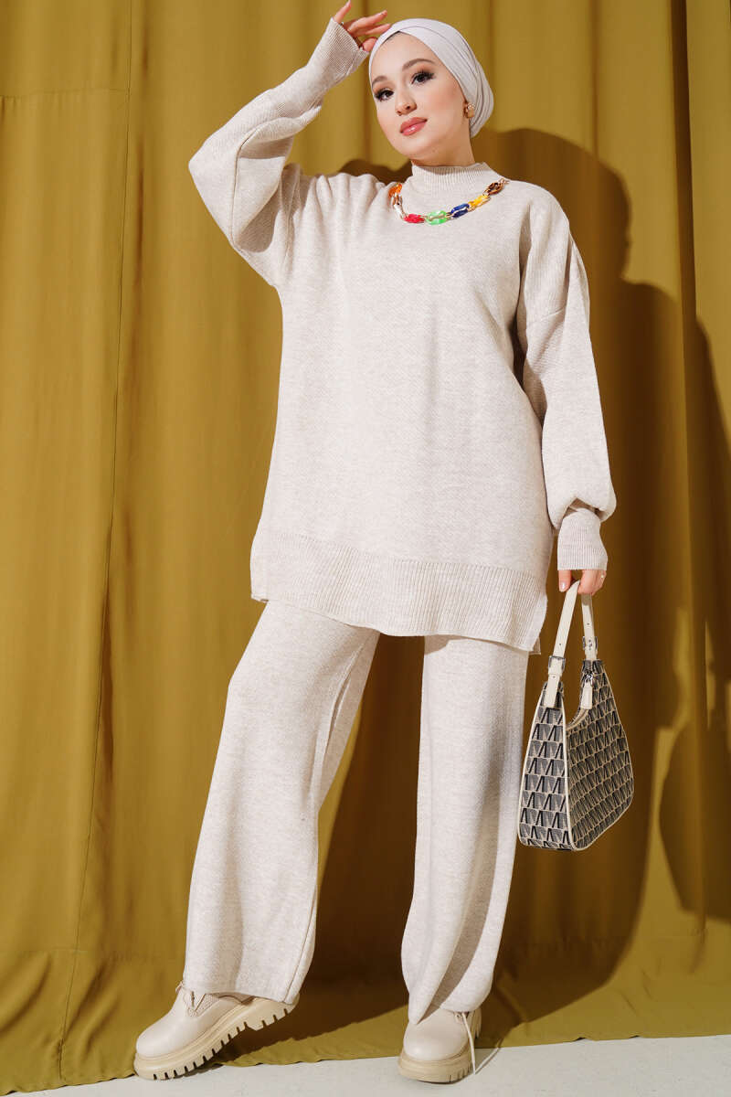 Taşlı Baklava Desen Triko İkili Takım Bej
