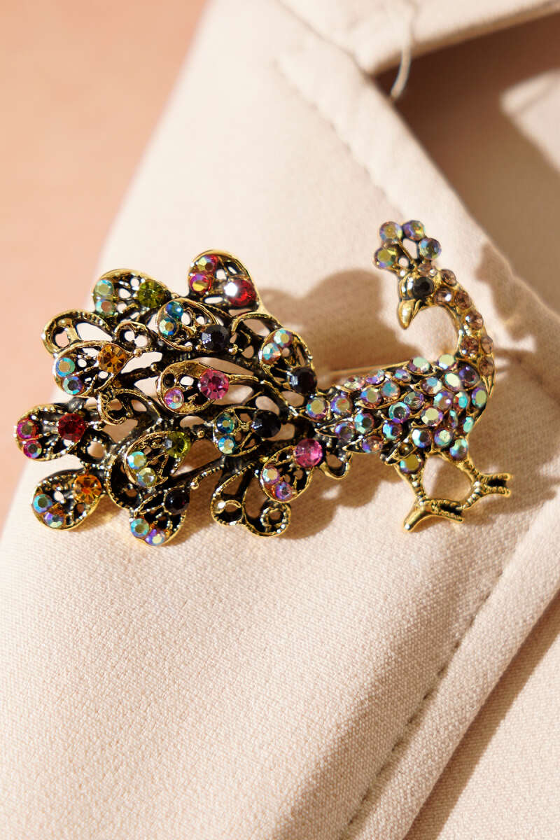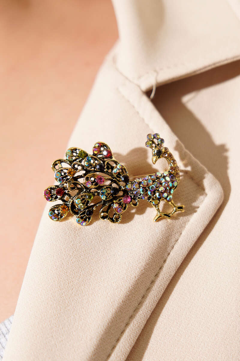 Renkli Kristal Taşlı Tavus Kuşu Figürlü Broş Gold