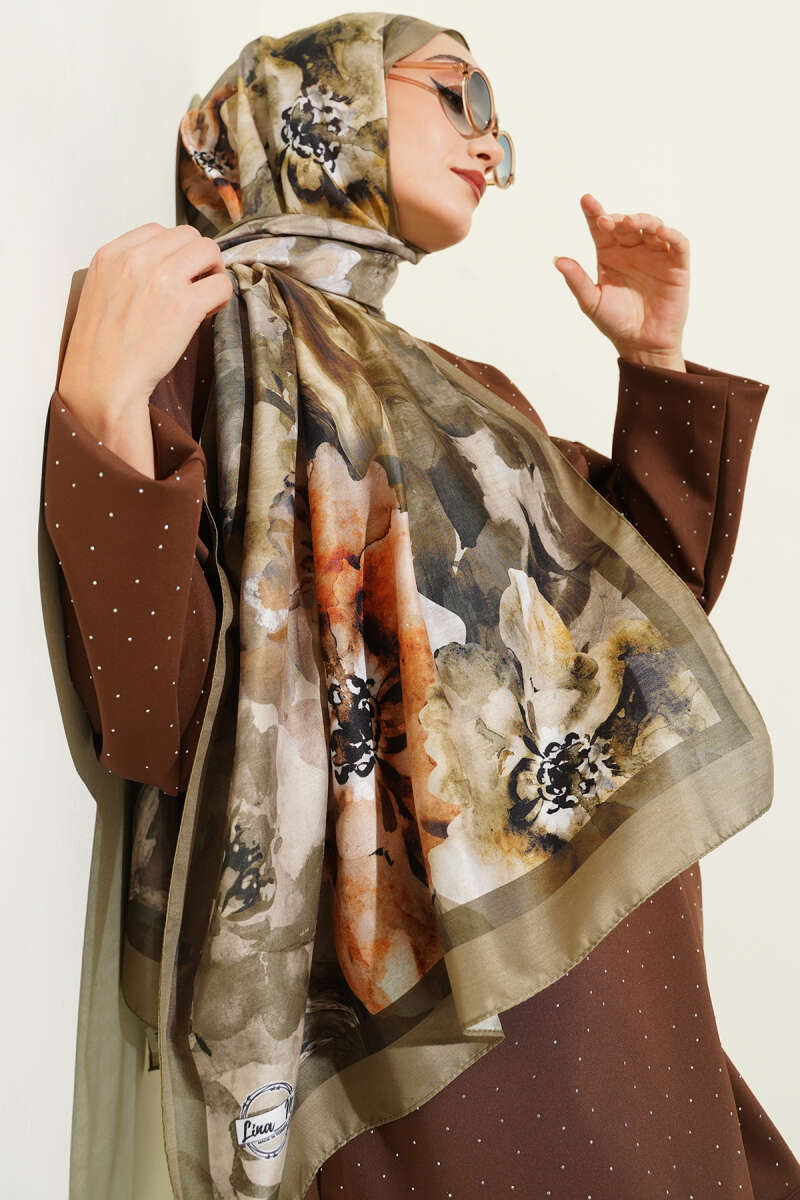 Çiçekli Soft Bambu Kraş Şal Haki