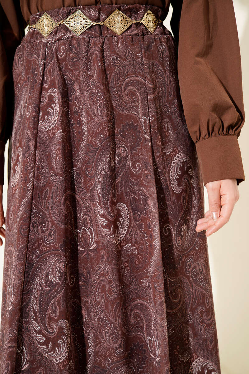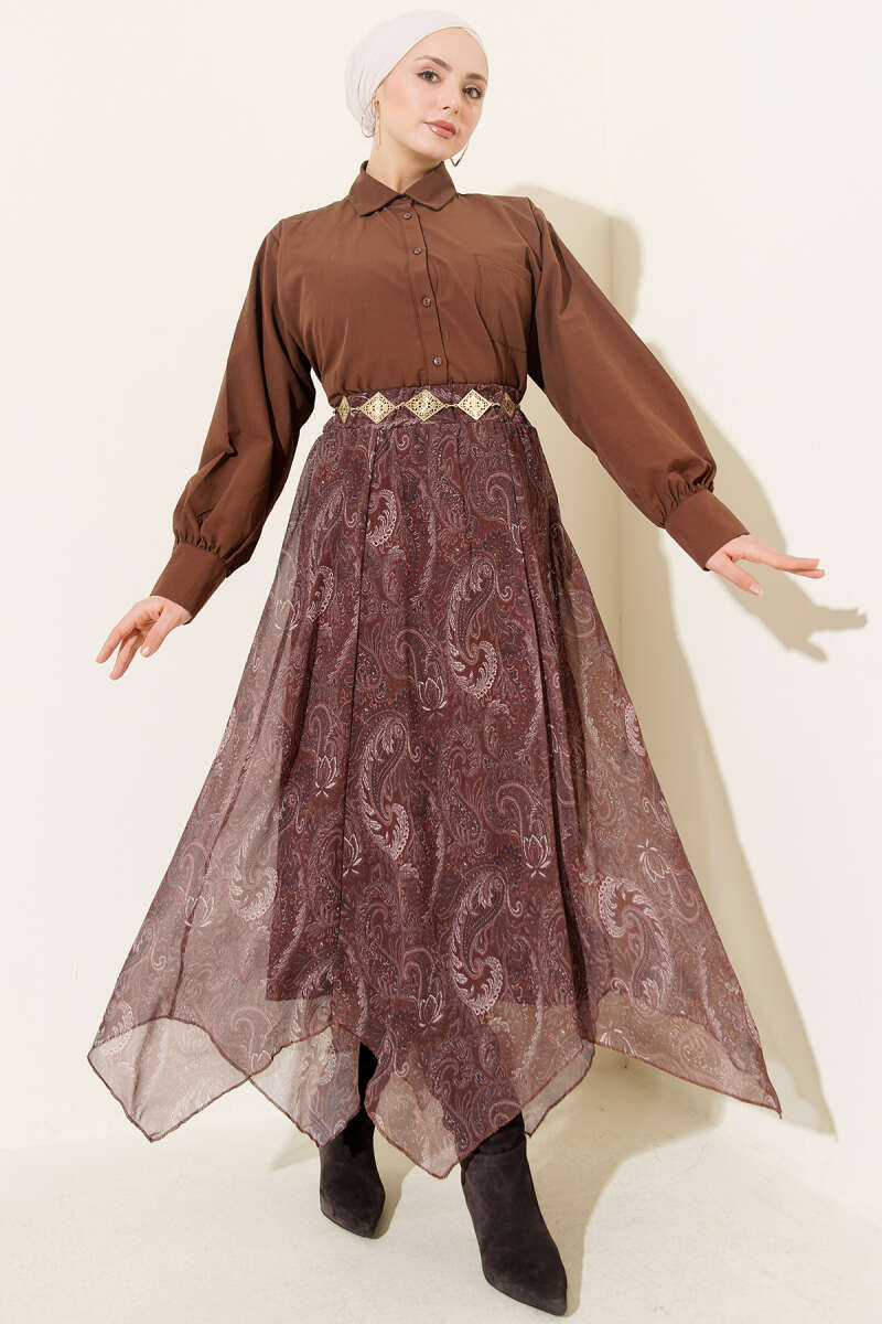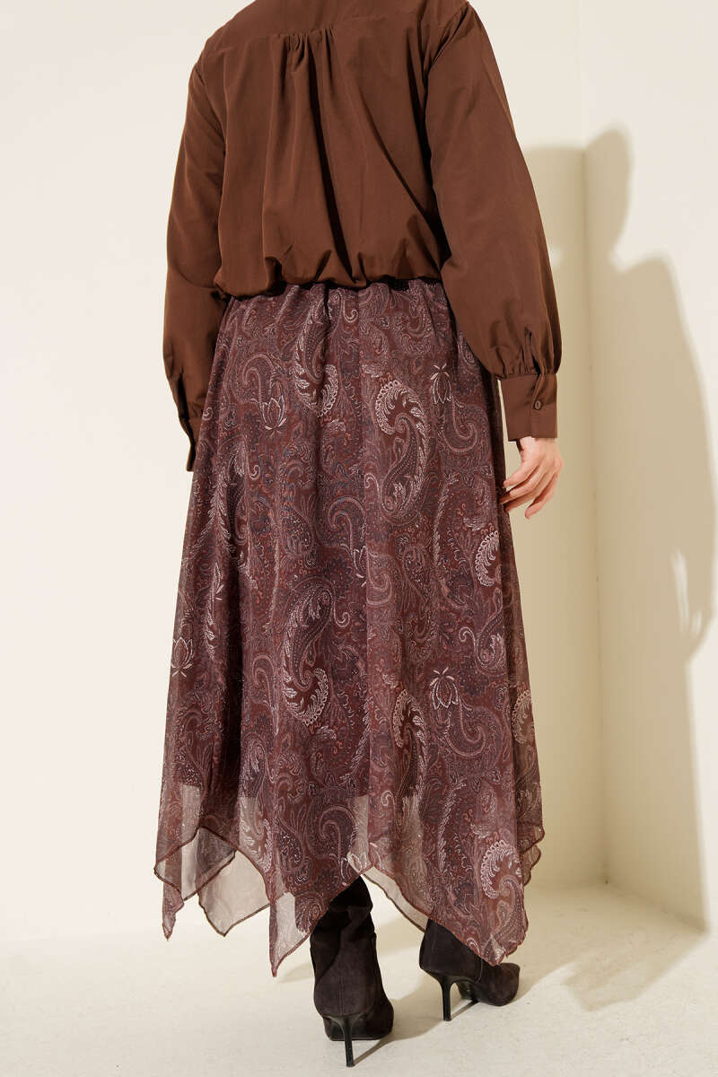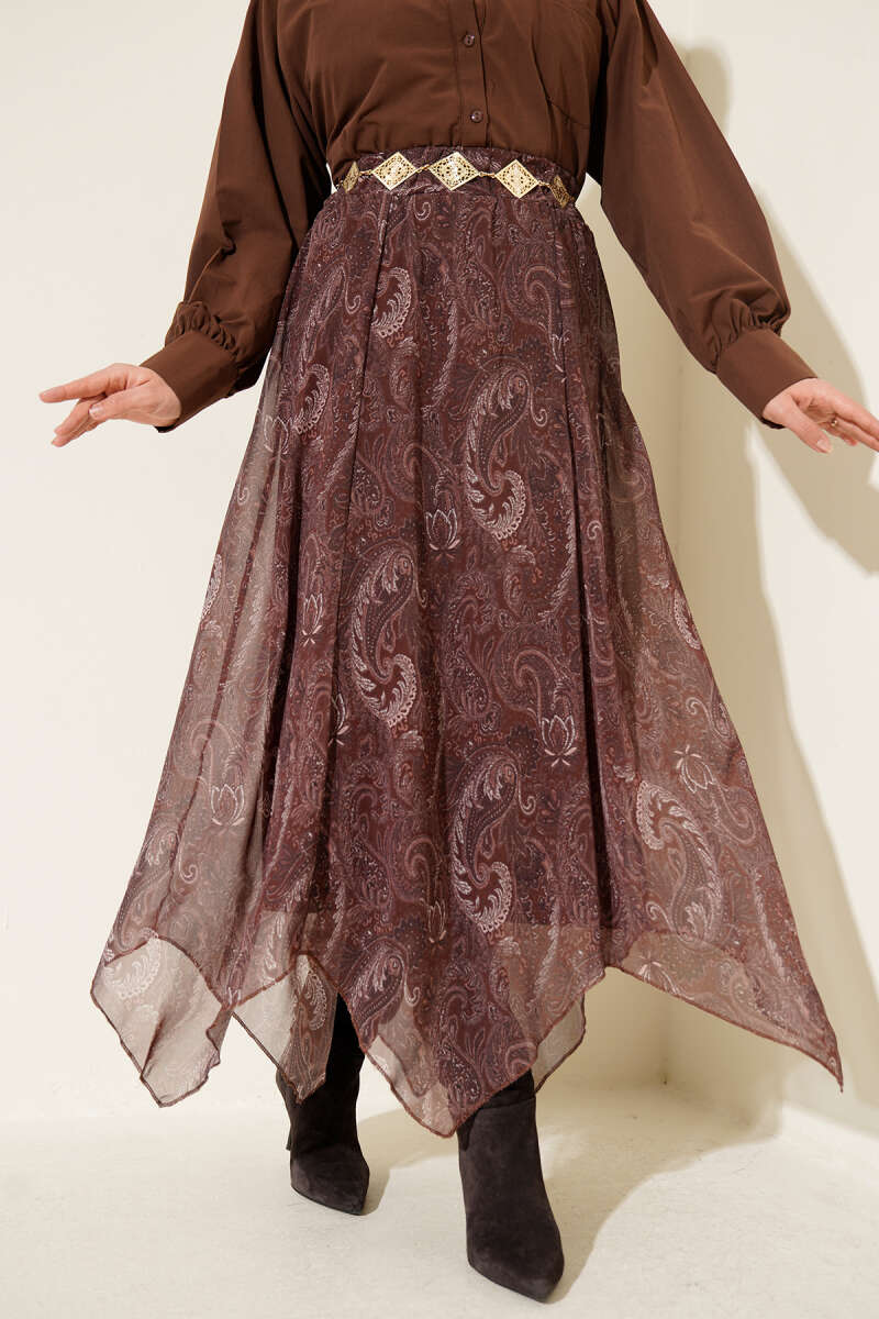 Bel Lastikli Çiçek Desen Tül Etek Kahve