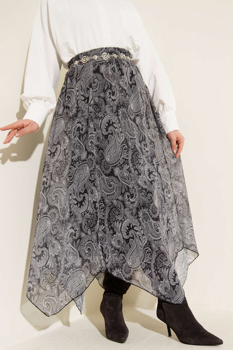 Retro Desen Asimetrik Şifon Etek Haki