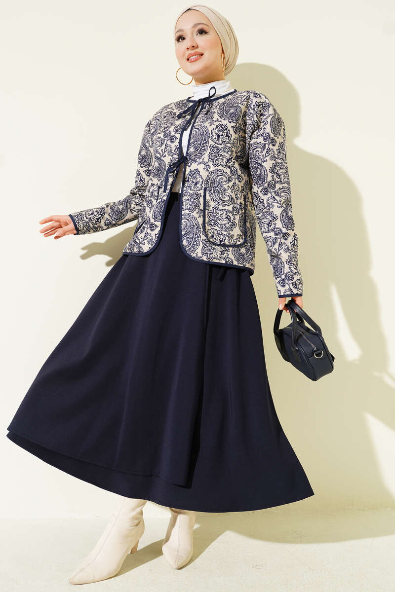 Retro Desen Kapitone Kısa Ceket Lacivert
