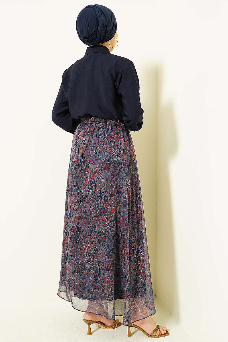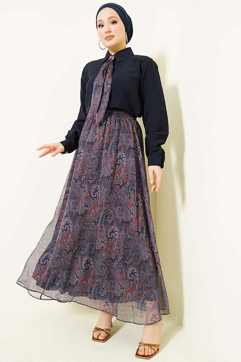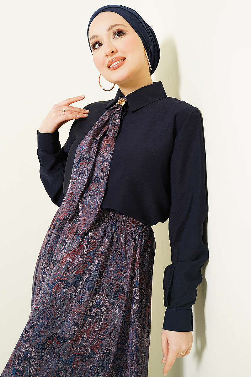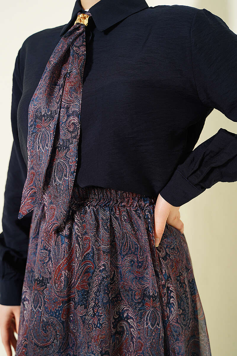 Retro Desenli Fularlı Etekli İkili Takım Lacivert