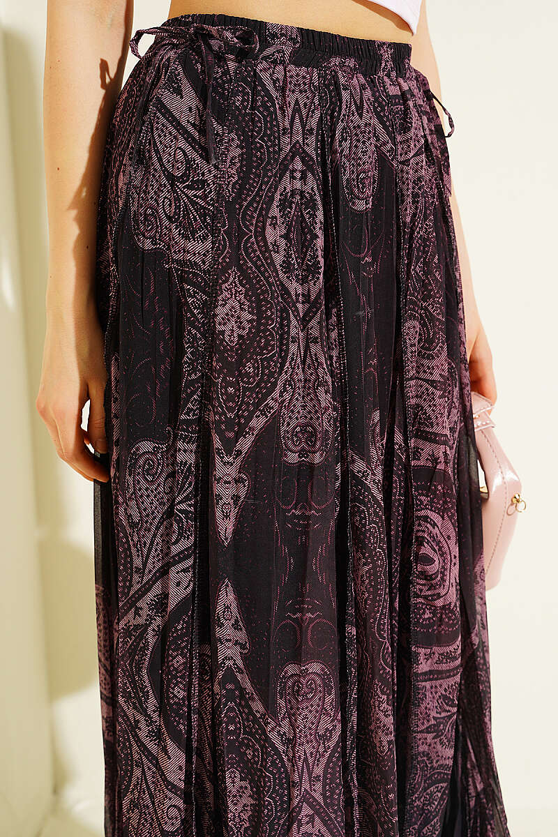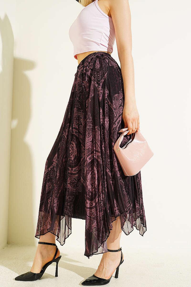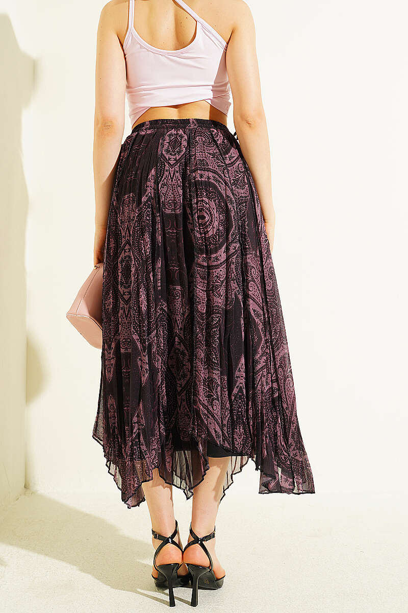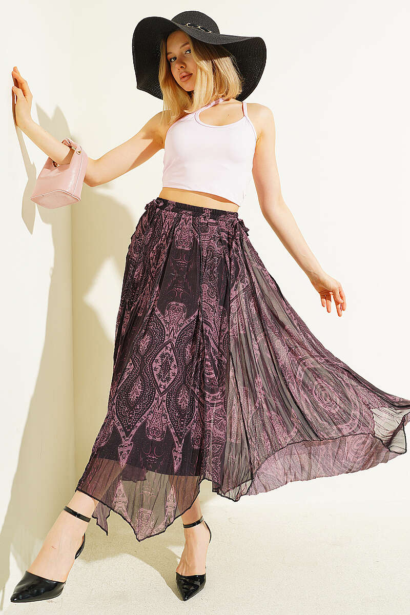 Retro Desenli Midi Şifon Etek Gül Kurusu