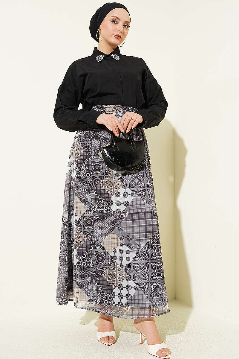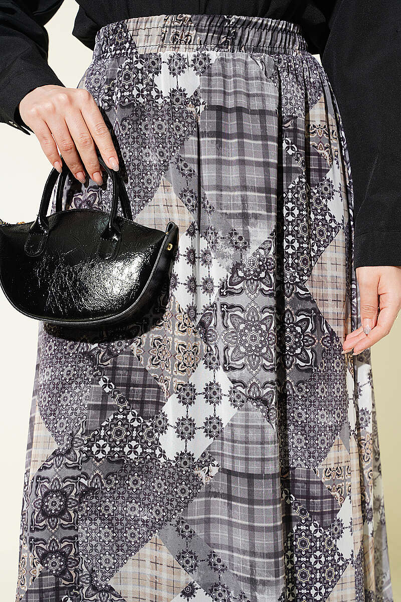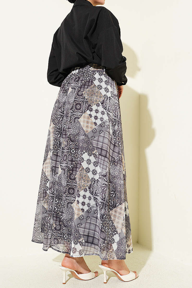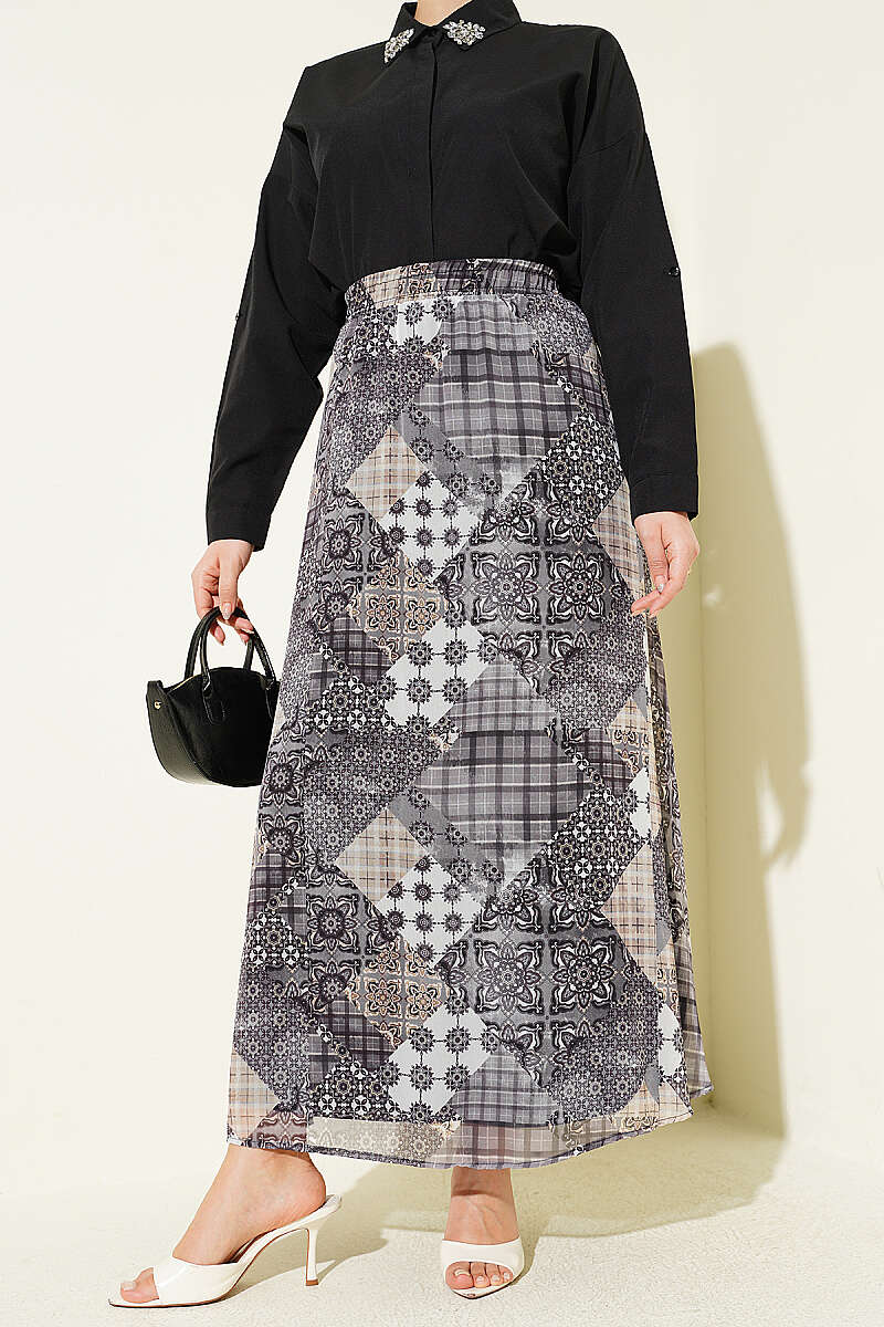 Retro Kare Çizgili Şifon Etek Füme