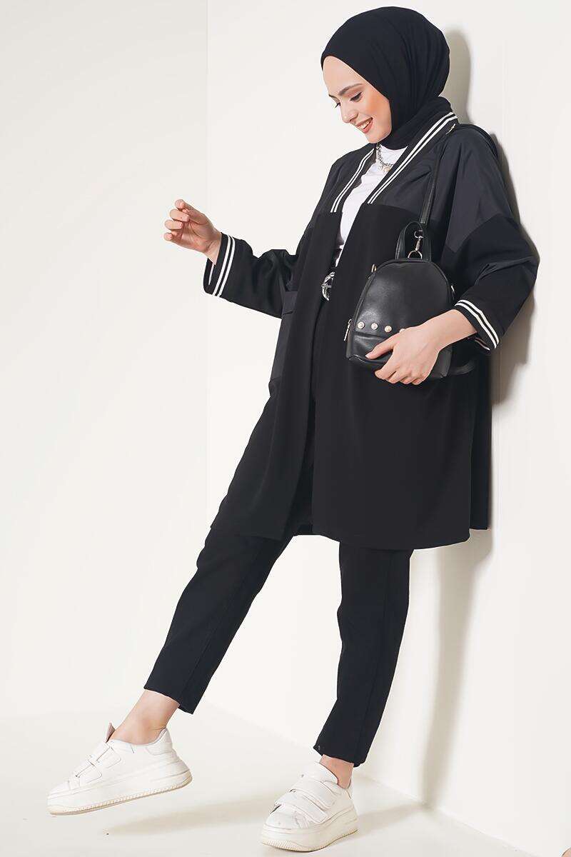 Yeni sezon kap modelimiz salaş yapısıyla rahat bir kombin sunmaktadır. Yakası ve bilekleri ribanalı olan kap iki adet göğüs cebine sahiptir.