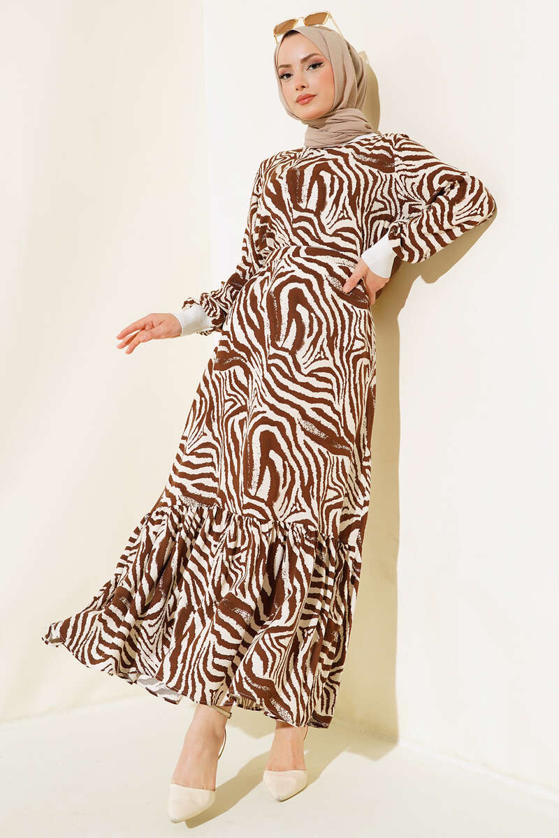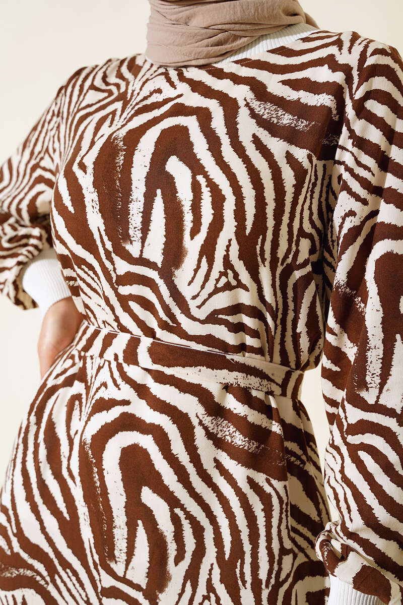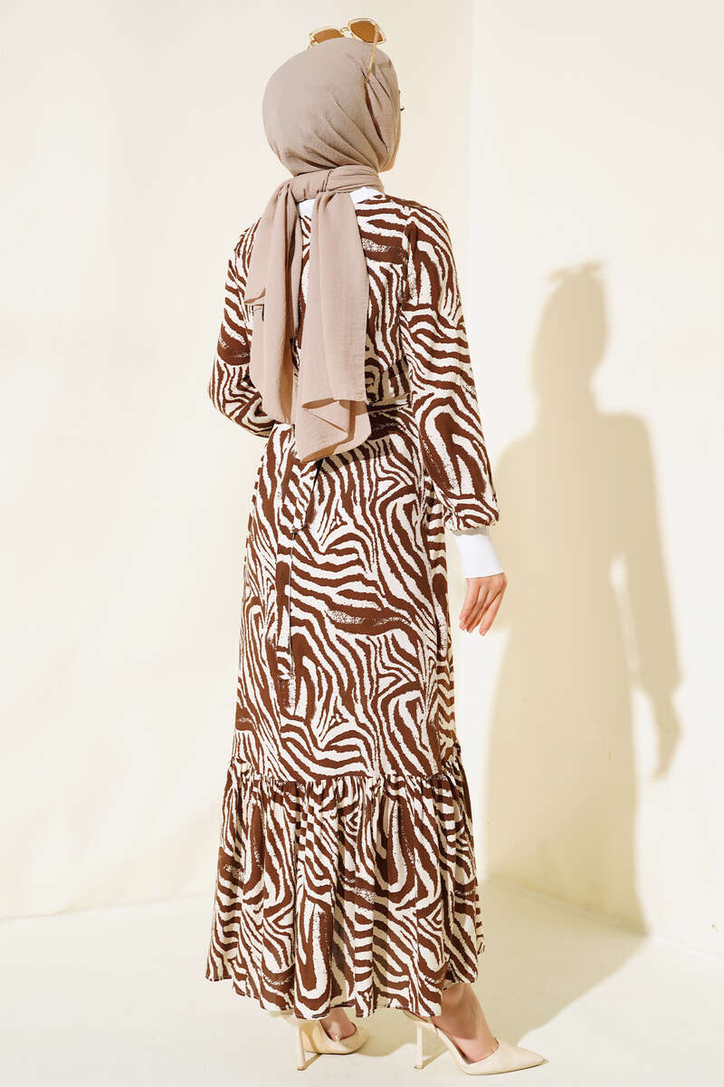 Kol Ucu Kürklü Fitilli Kaşe Elbise Kahve