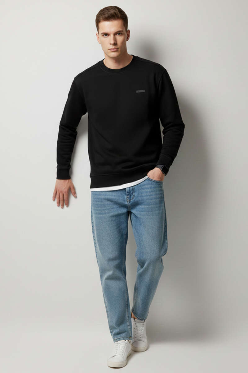 Ribanalı Yaka Yazılı Erkek Sweatshirt Siyah