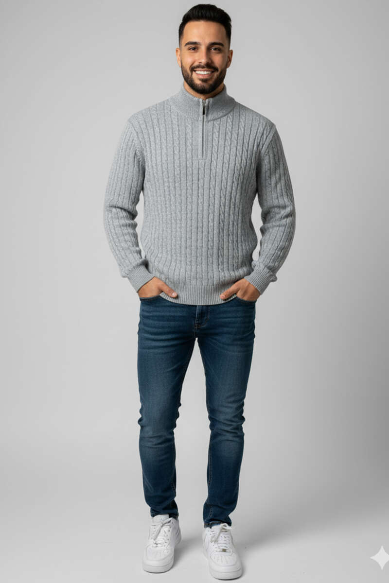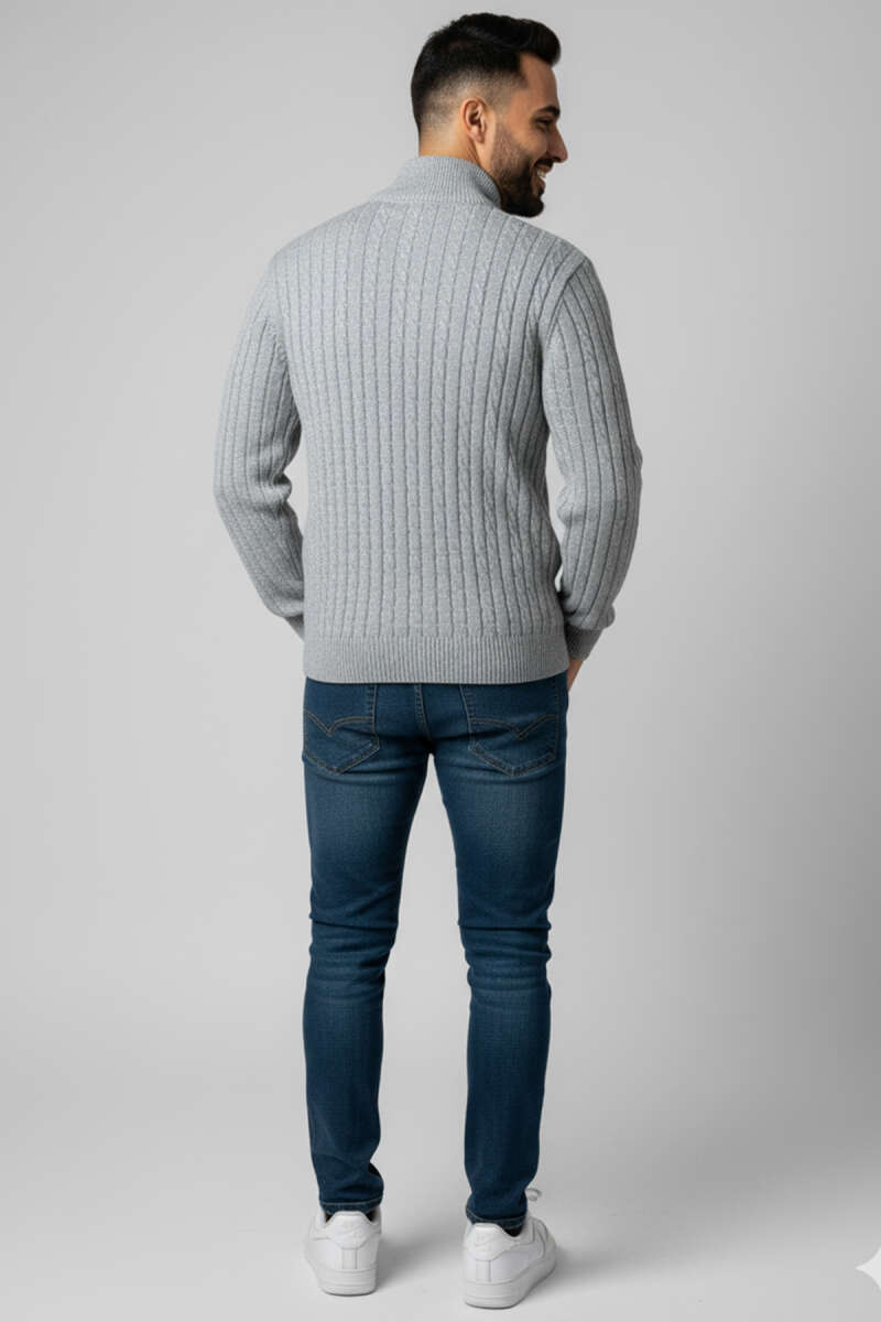 Saç Örgü Detaylı Fermuarlı Triko Kazak Füme