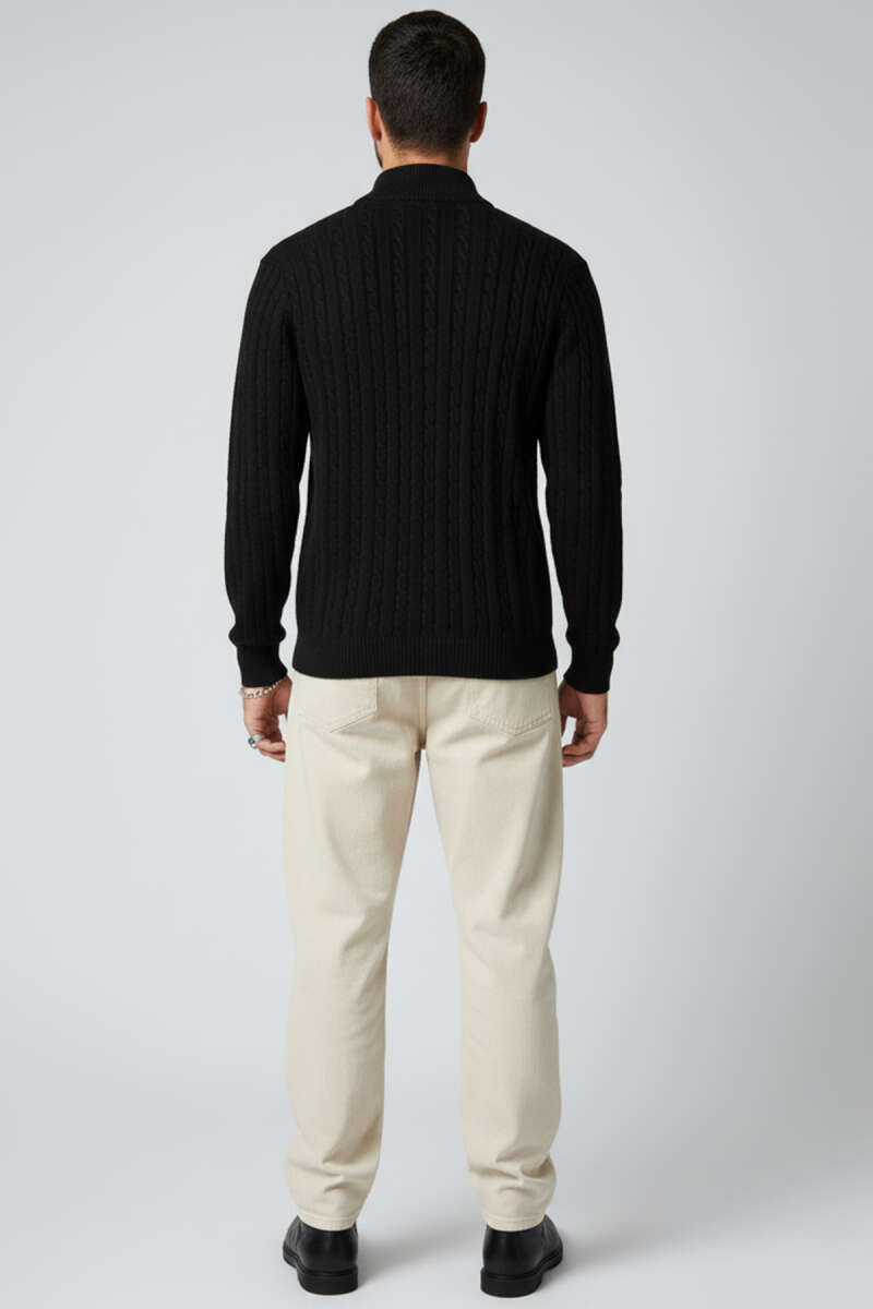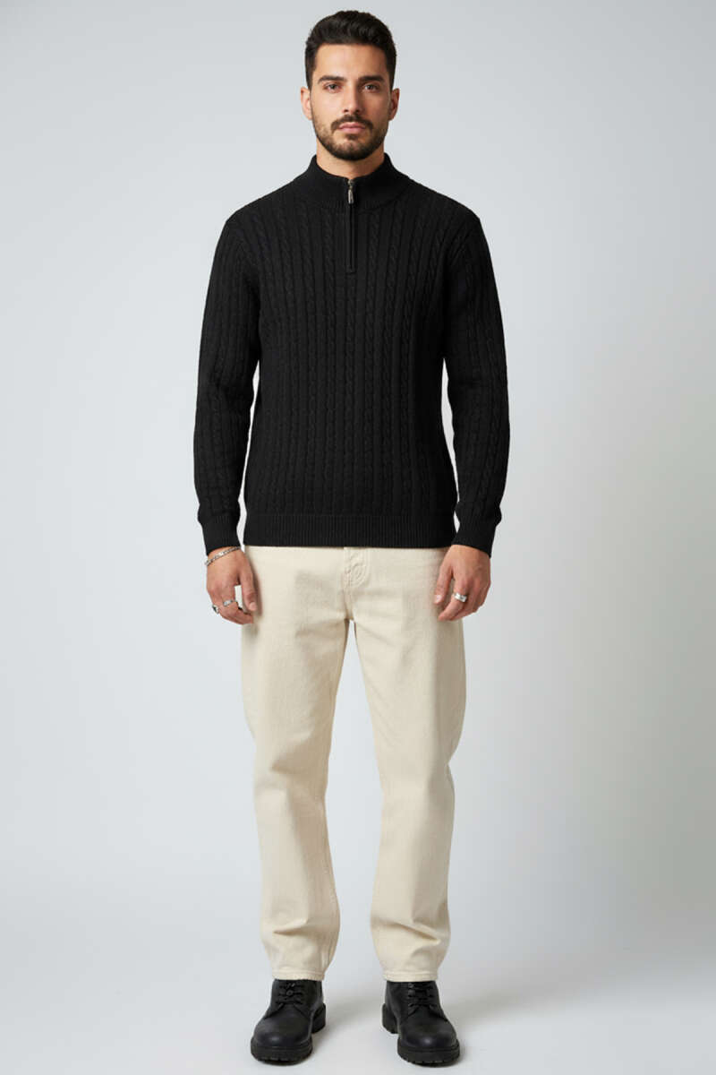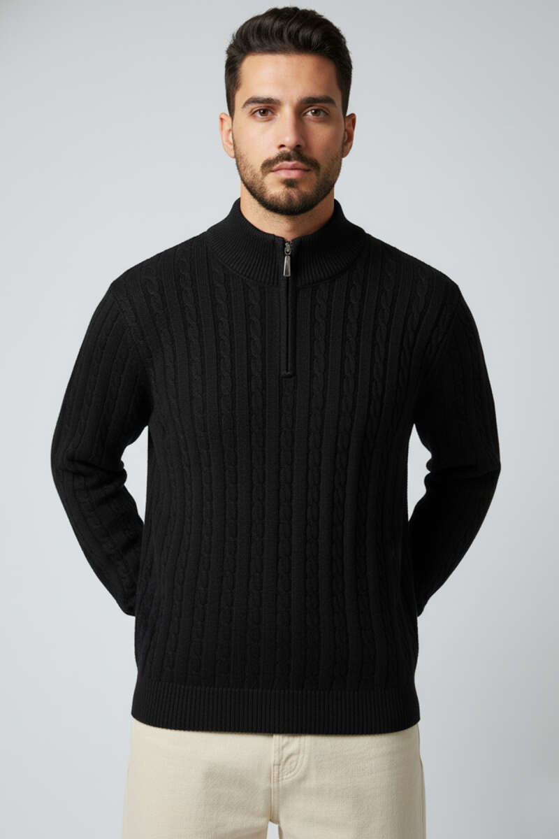 Yarım Fermuarlı Örgü Erkek Triko Kazak Siyah