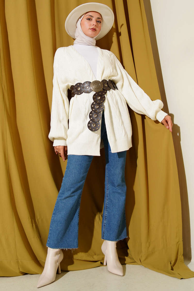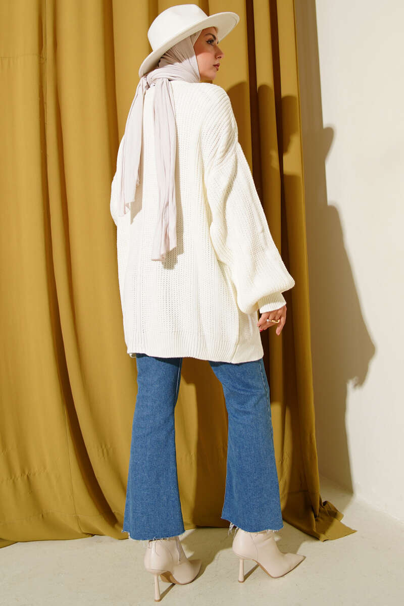 Düğmeli Pile Detaylı Triko Hırka Krem