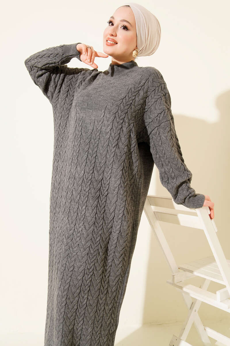 Saç Örgü Kabartmalı Triko Elbise Taş