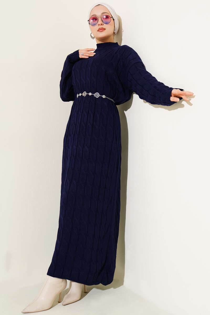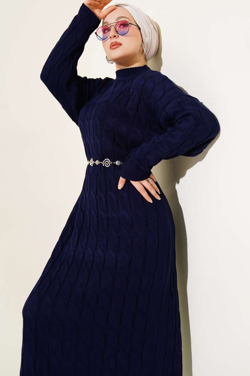 Saç Örgü Şeritli Triko Elbise Yağ Yeşili