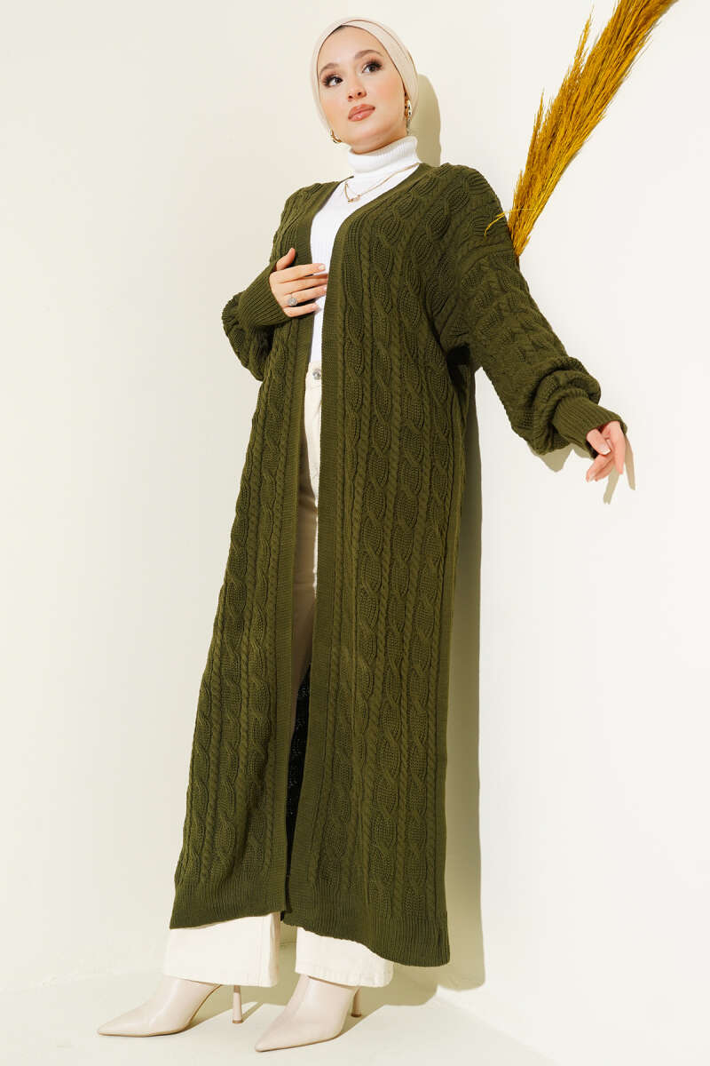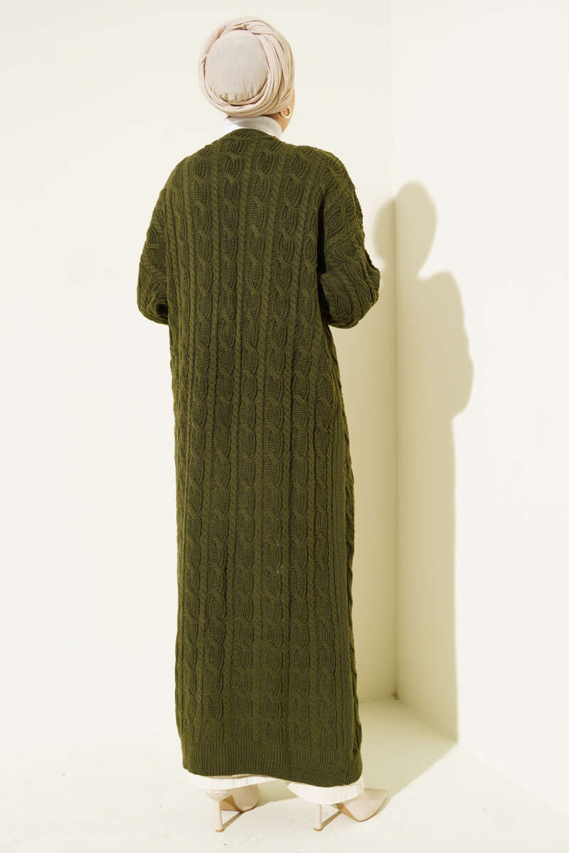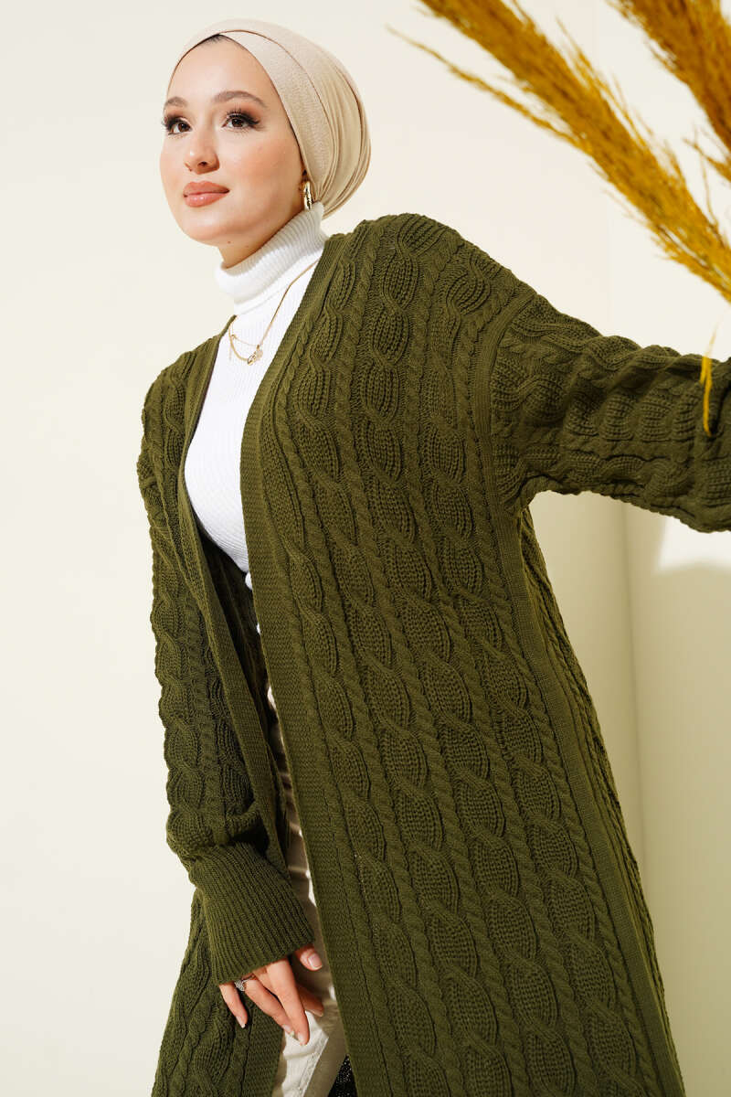 Saç Örgü Uzun Triko Hırka Haki