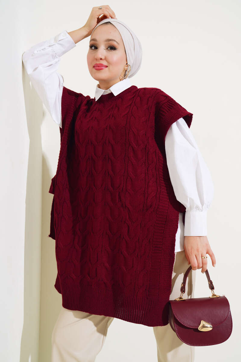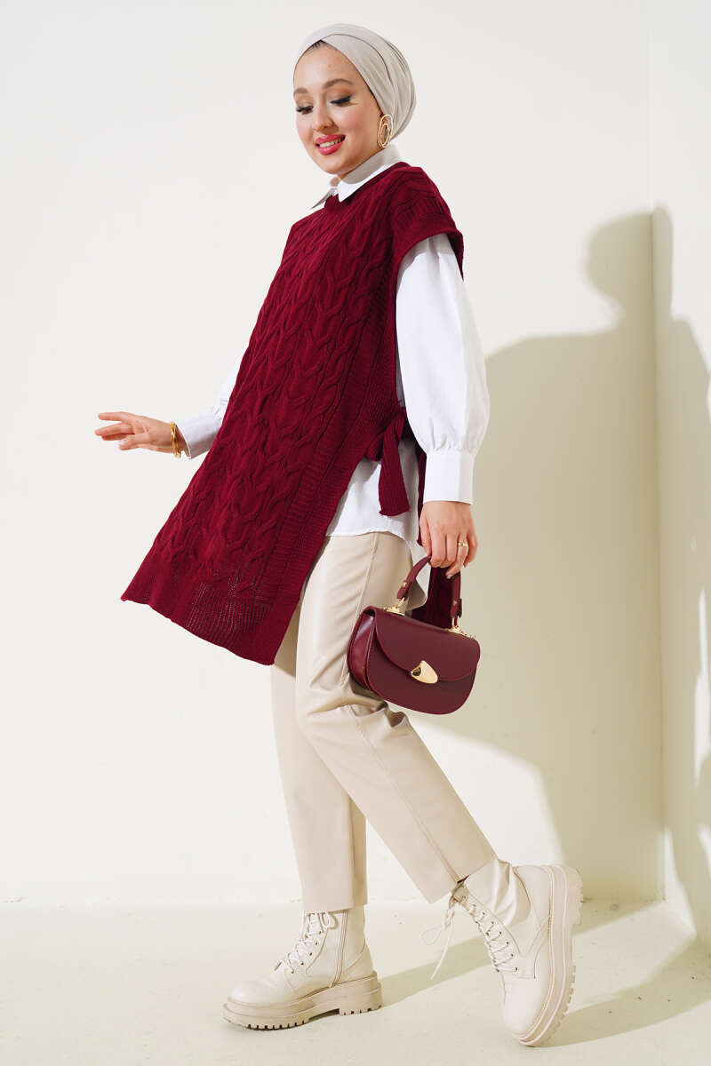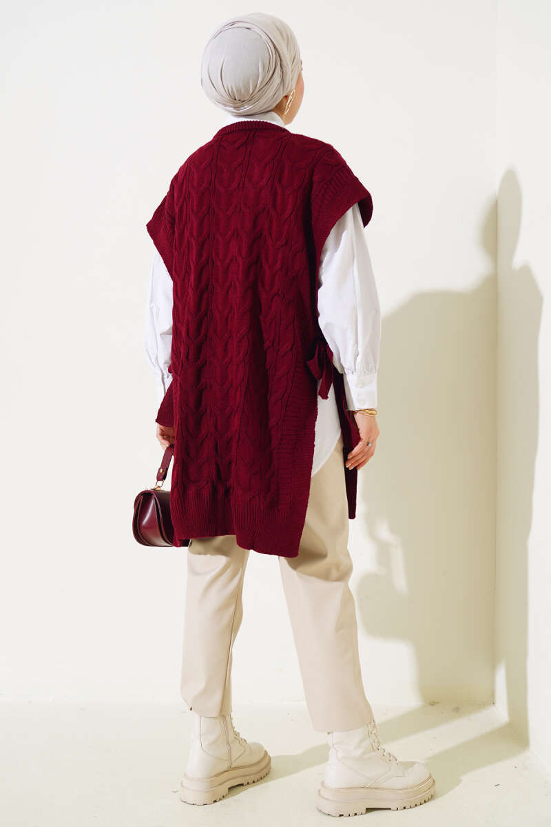 Saç Örgü Yan Bağlamalı Triko Süveter Bordo