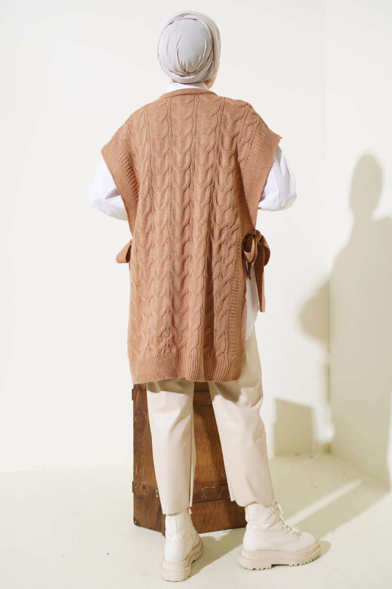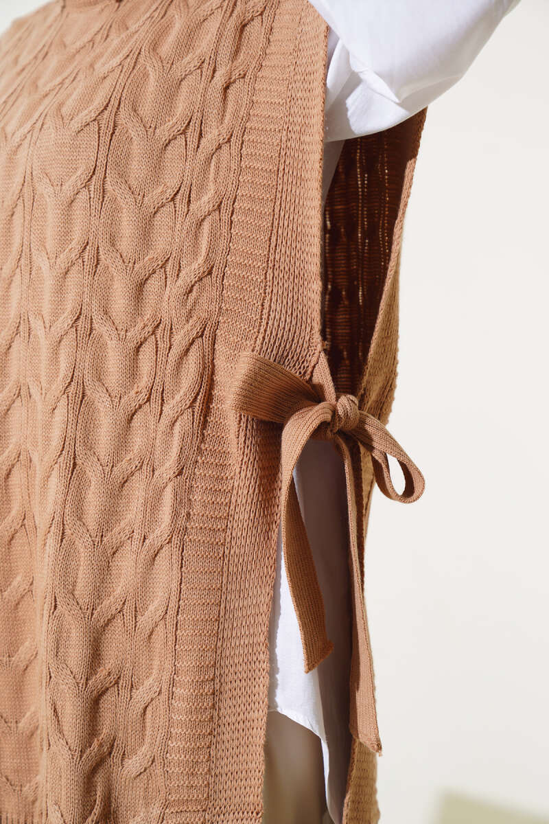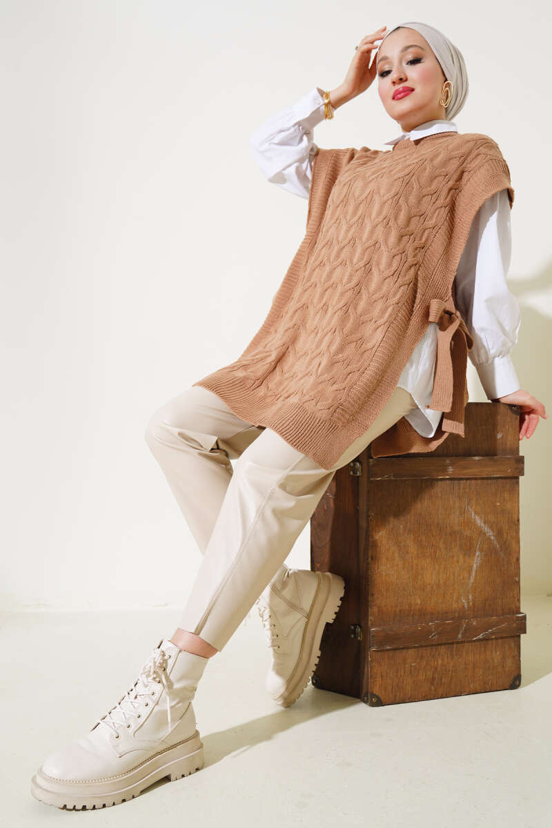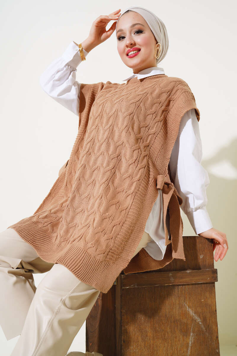Saç Örgü Yan Bağlamalı Triko Süveter Büsküvi