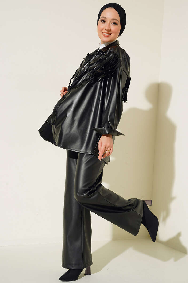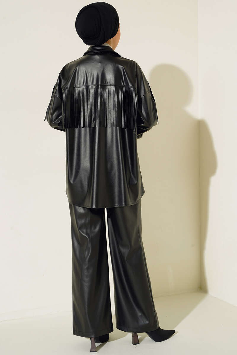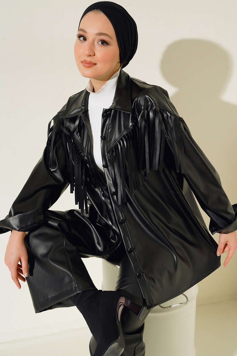 Yeni sezon deri gömleğimiz farklı tarzıyla dikkat çekmektedir. Göğsü ve omuzları saçaklı olan gömleğimiz klasik yakadır. Şık duruşuyla sezonun favorisi olan gömleğimizin renk seçenekleri mevcuttur.