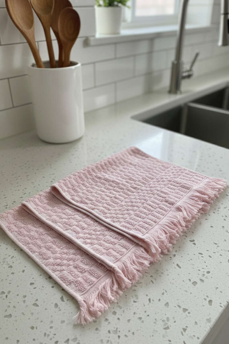 Saçaklı Kare Desenli 3'lü Mutfak Havlusu Gül Kurusu