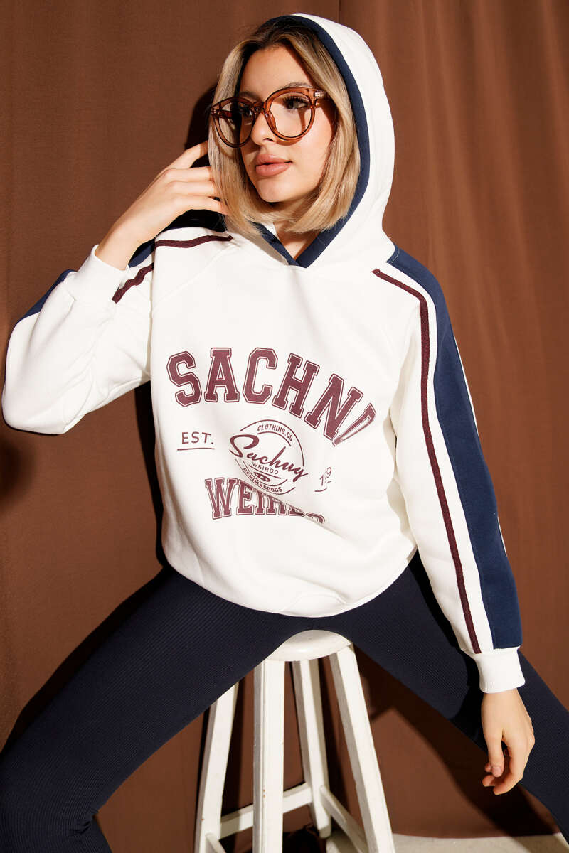 Sachno Baskılı Kapüşonlu Sweatshirt Ekru