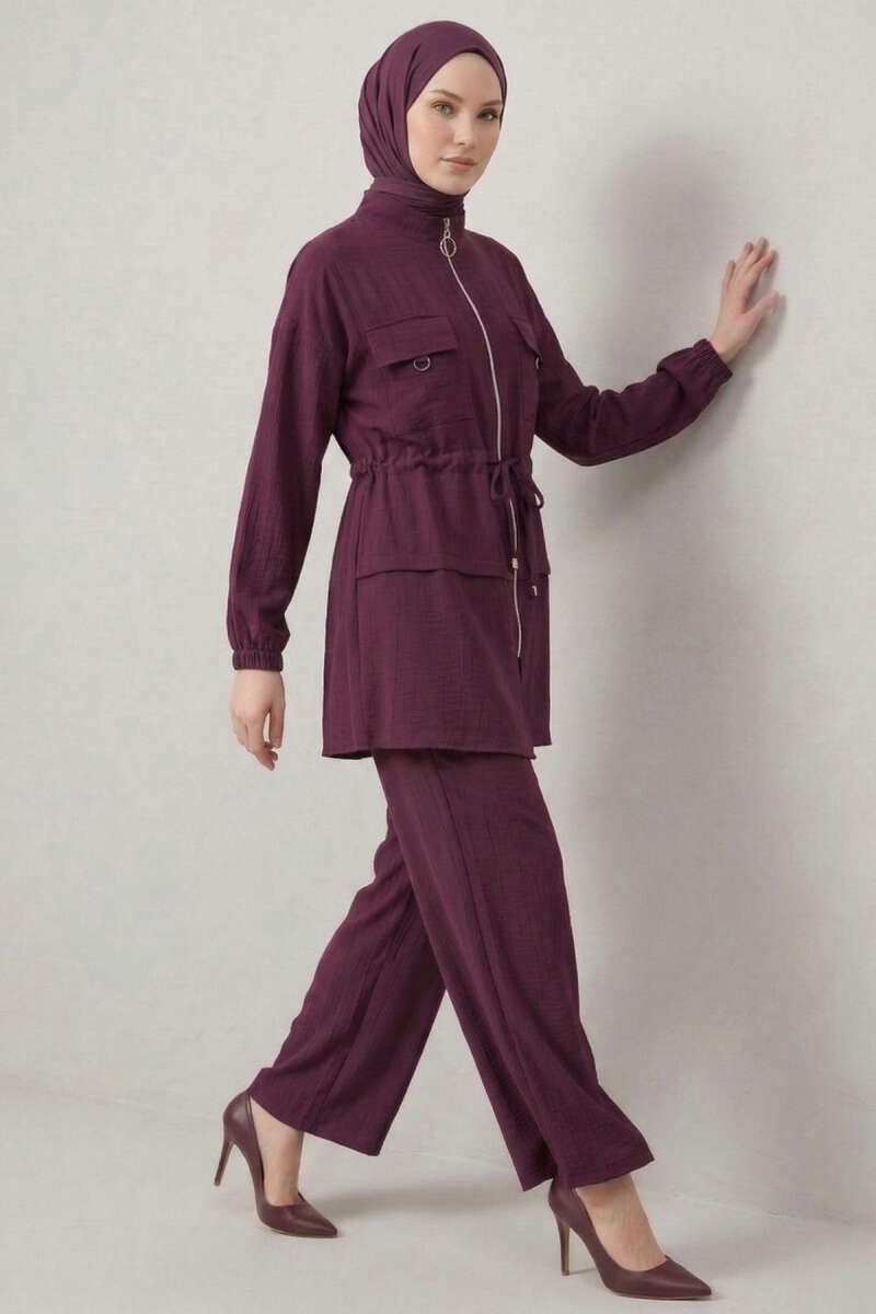 Sahte Cep Kapaklı Fermuarlı İkili Takım Burgonya