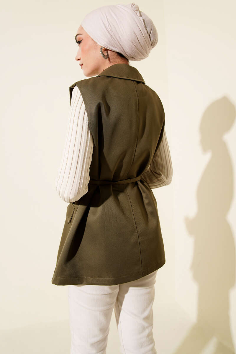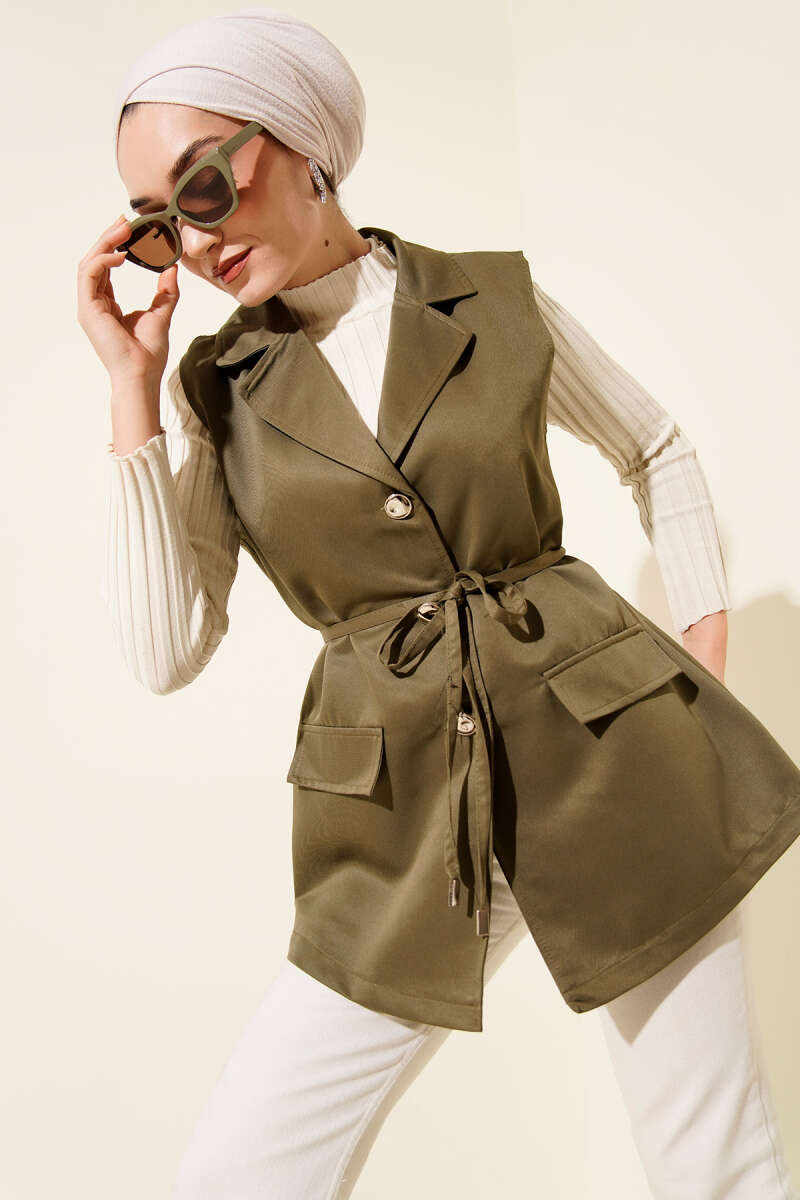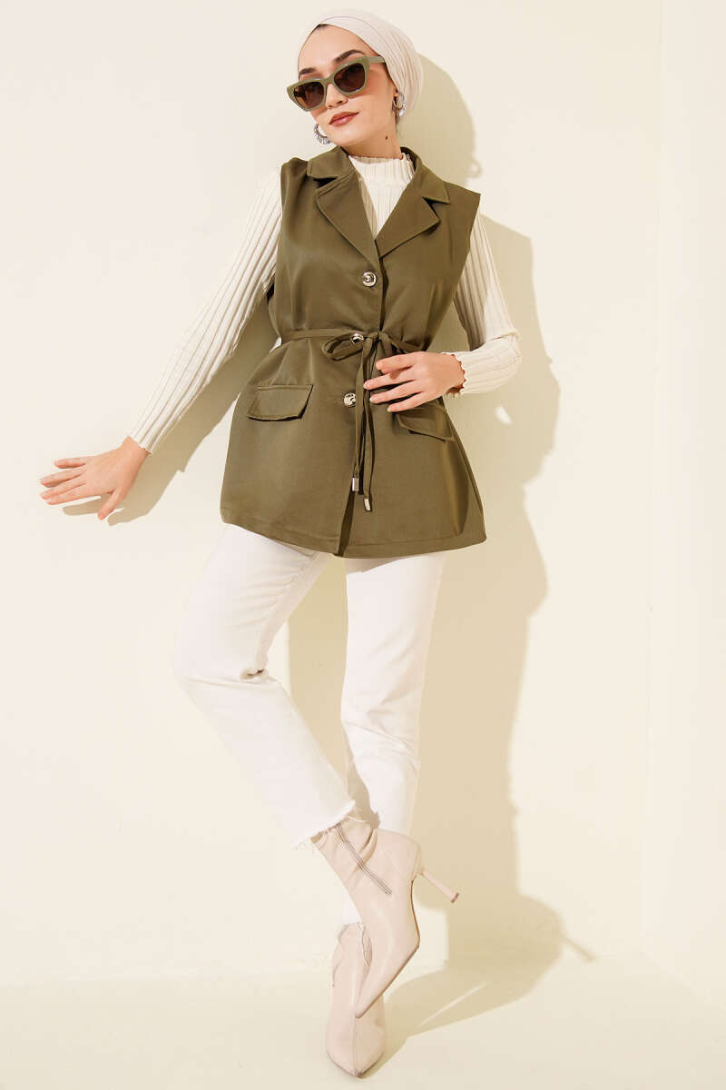 Düğmeli Uzun Buklet Yelek Haki