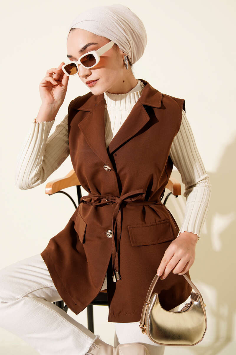 Sahte Cepli İp Kuşaklı Yelek Krem