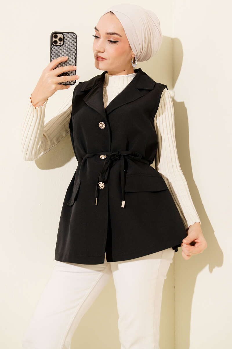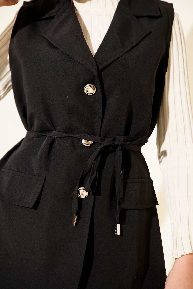Düğmeli Uzun Buklet Yelek Siyah